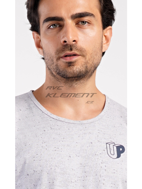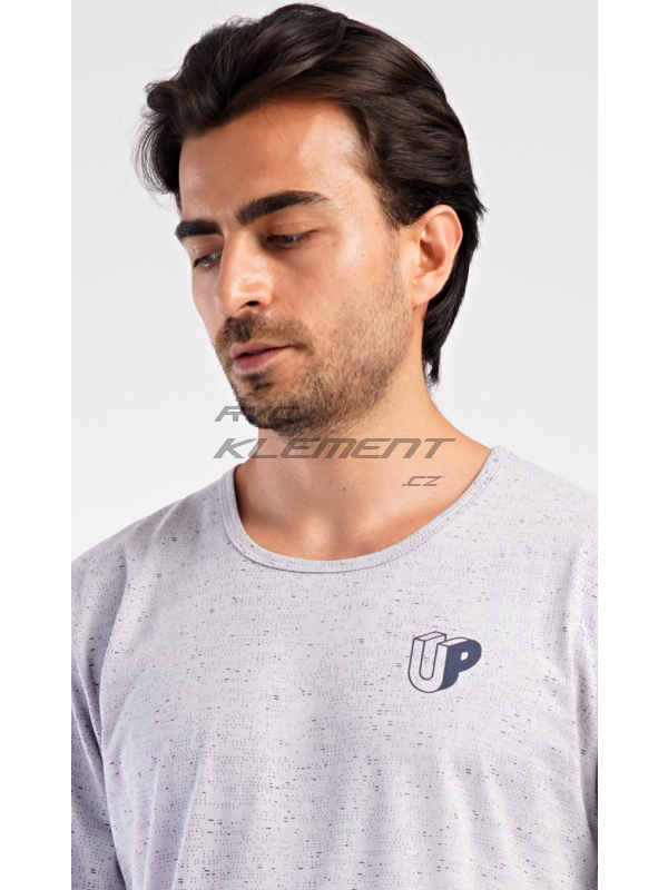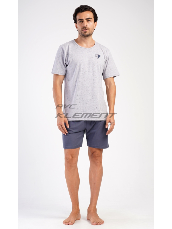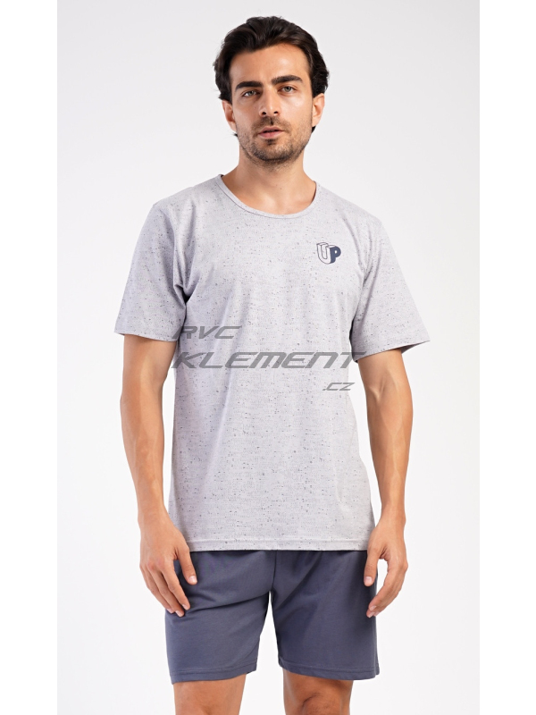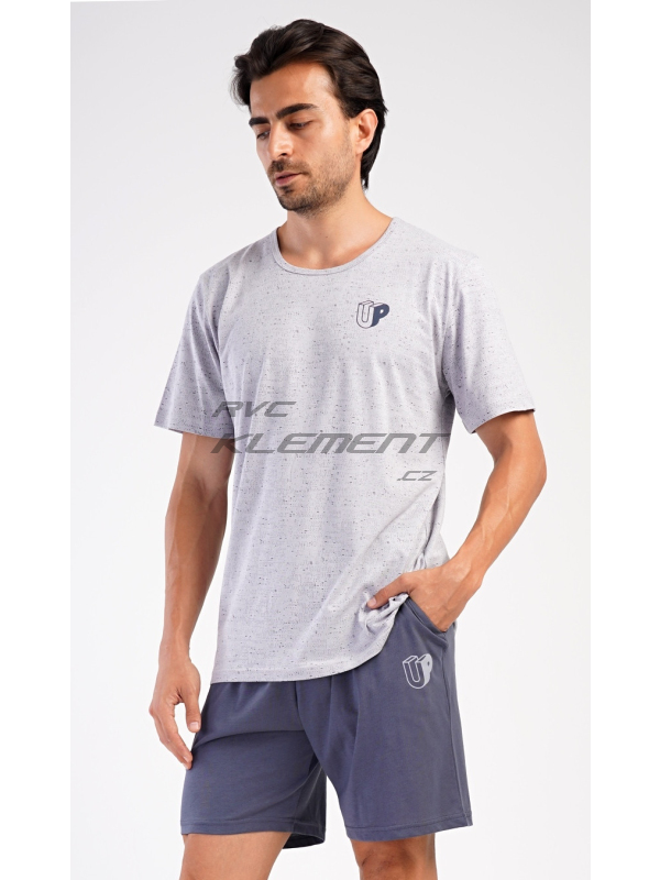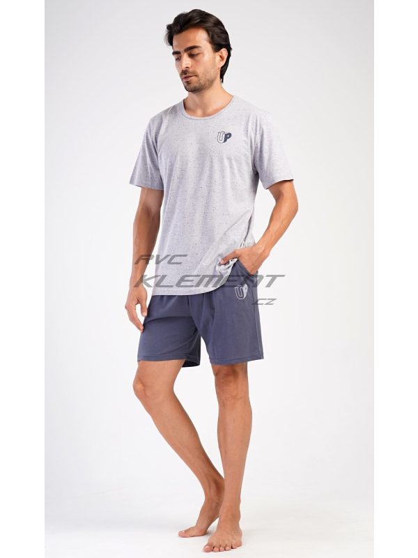 Pánské šortkové pyžamo Pedro. Pánské bavlněné šortkové pyžamo Pedro. Pánské pyžamo se skládá z trička s krátkým rukávem a krátkých šortkových kalhot. Tričko je zdobené nepravidelnými proužky a nápisem ’UP’. Drobný nápis najdete i na jednobarevných šortkách, které mají v pase gumu, šňůrku na stažení a praktické kapsy. Použitý materiál s obsahem bavlny 100% je poddajný a příjemný na dotek. Pokyny pro údržbu: - 100% bavlna Míry naměřené na výrobku: