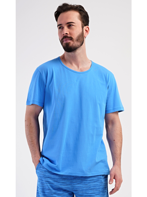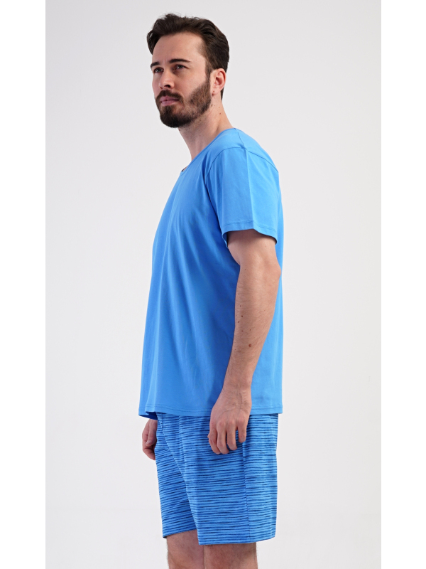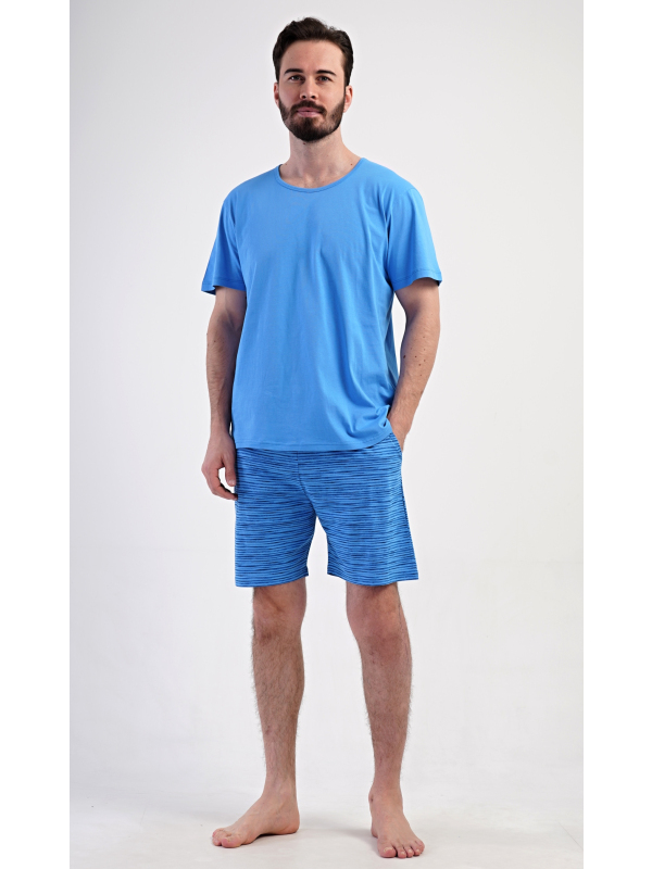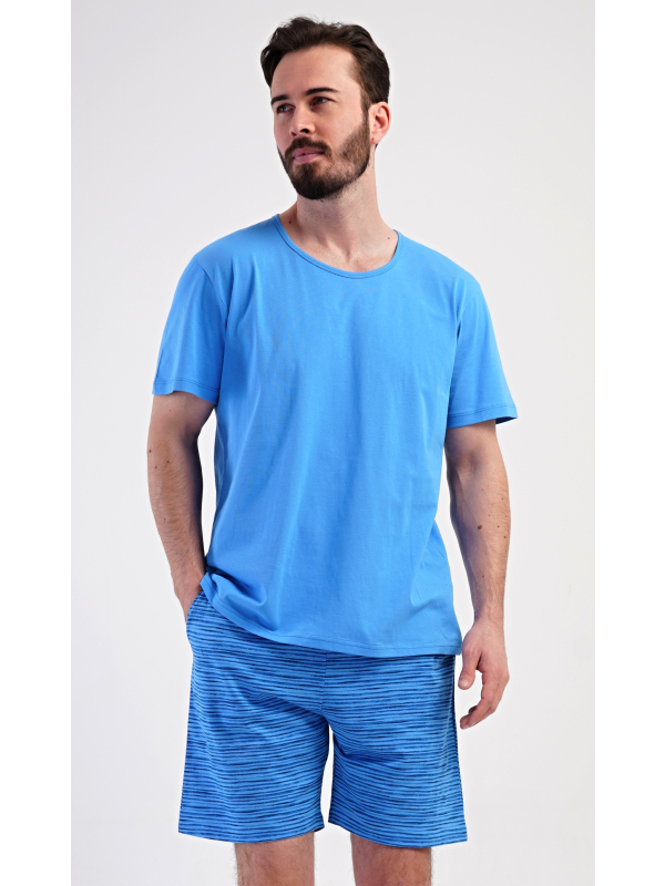 Pánské šortkové pyžamo Sebastian. Pánské bavlněné šortkové pyžamo Sebastian. Pánské pyžamo se skládá z trička s krátkým rukávem a krátkých šortkových kalhot. Jednobarevné tričko má kulatý výstřih a je vhodné pro všechny milovníky pohodlné módy bez potisku. Tričko doplňují šortky s potiskem zvlněných proužků, které mají v pase gumu, šňůrku na stažení a praktické kapsy. Použitý materiál s obsahem bavlny 100% je příjemný a poddajný na dotek. Pokyny pro údržbu: - 100% bavlna Míry naměřené na výrobku:
