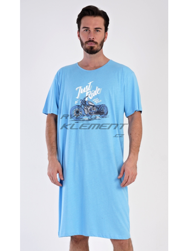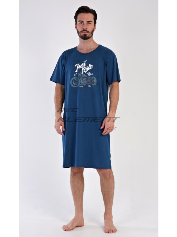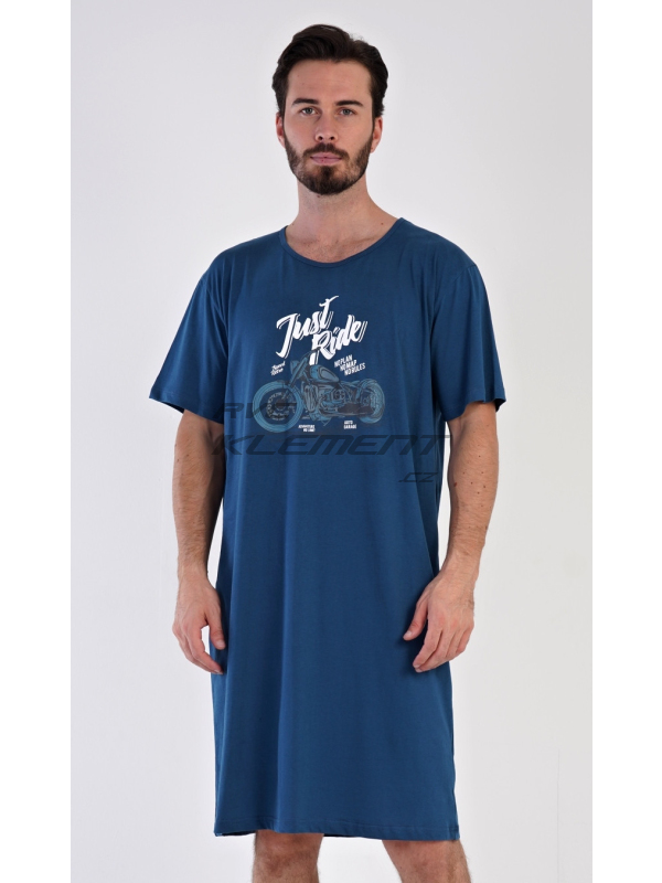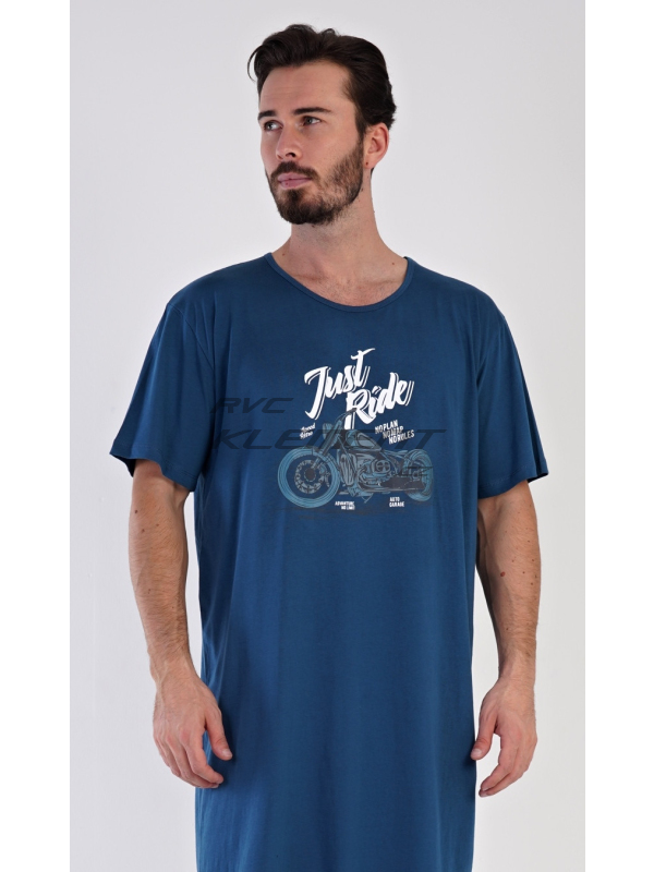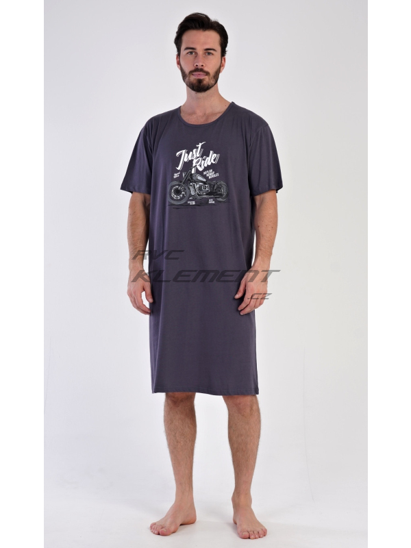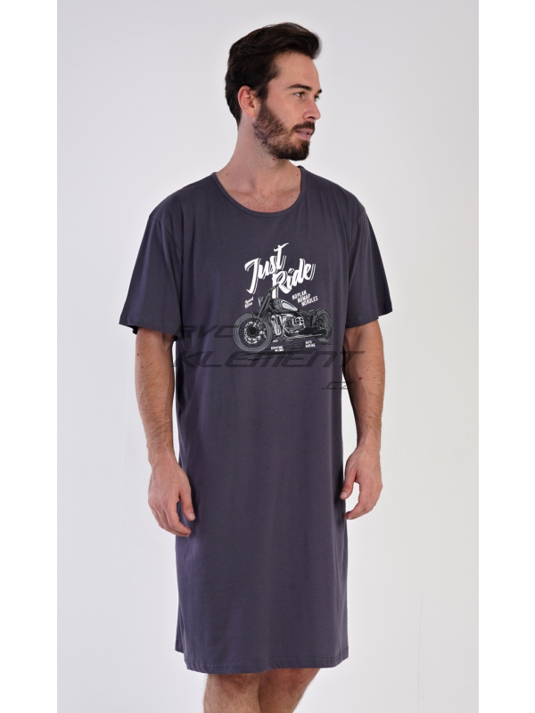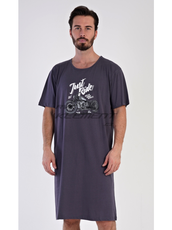 Pánská noční košile s krátkým rukávem Samuel. Pánská bavlněná noční košile s krátkým rukávem Samuel. Jednobarevná pánská noční košile s kulatým výstřihem je zdobena větším obrázkem motorky a nápisem JUST RIDE. Tato košile je vhodným dárkem pro všechny milovníky motorek. Použitý materiál je příjemný a poddajný na dotek. Obsah bavlny je 100%. Pokyny pro údržbu: -100 % bavlna Míry naměřené na výrobku:
