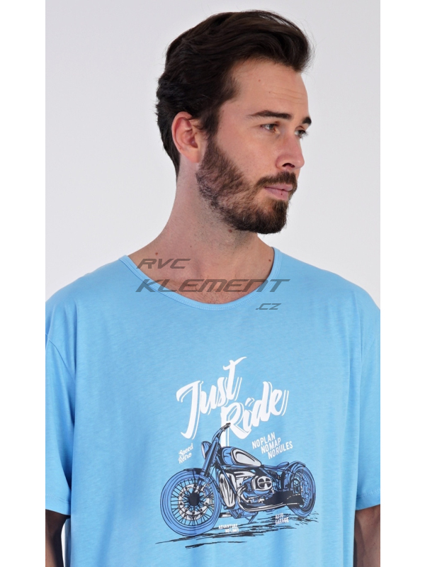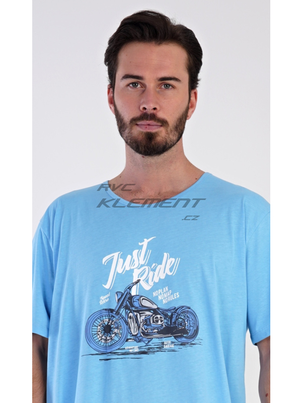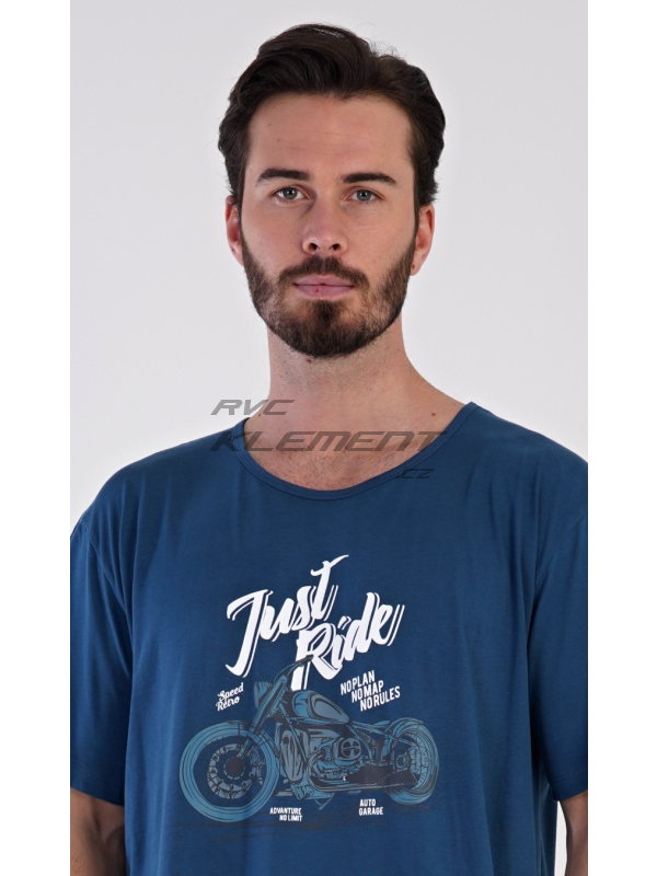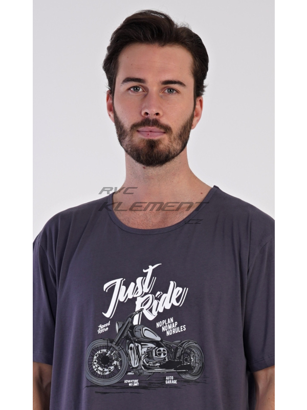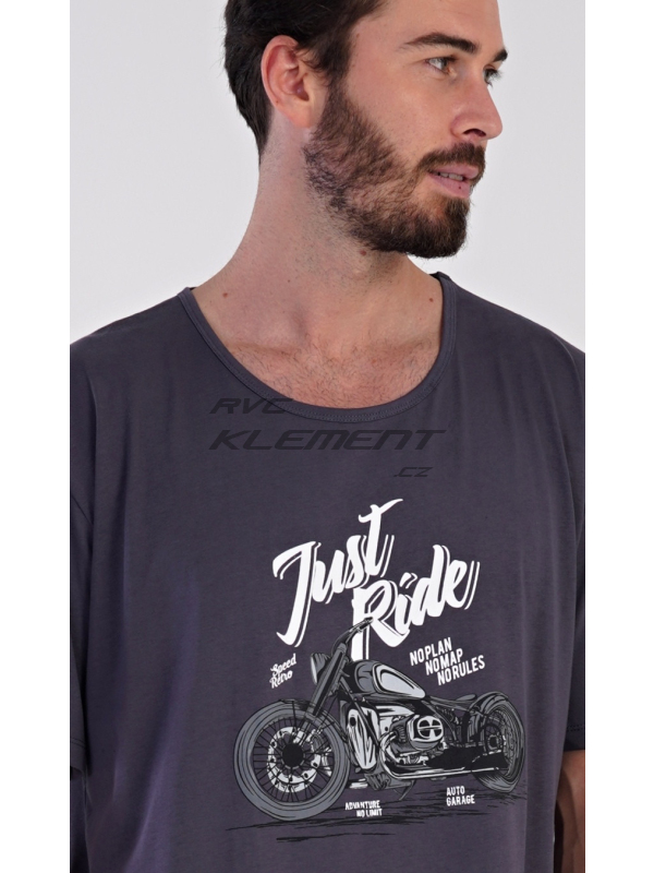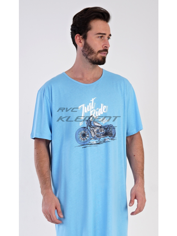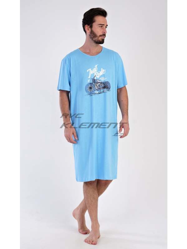 Pánská noční košile s krátkým rukávem Samuel. Pánská bavlněná noční košile s krátkým rukávem Samuel. Jednobarevná pánská noční košile s kulatým výstřihem je zdobena větším obrázkem motorky a nápisem JUST RIDE. Tato košile je vhodným dárkem pro všechny milovníky motorek. Použitý materiál je příjemný a poddajný na dotek. Obsah bavlny je 100%. Pokyny pro údržbu: -100 % bavlna Míry naměřené na výrobku: