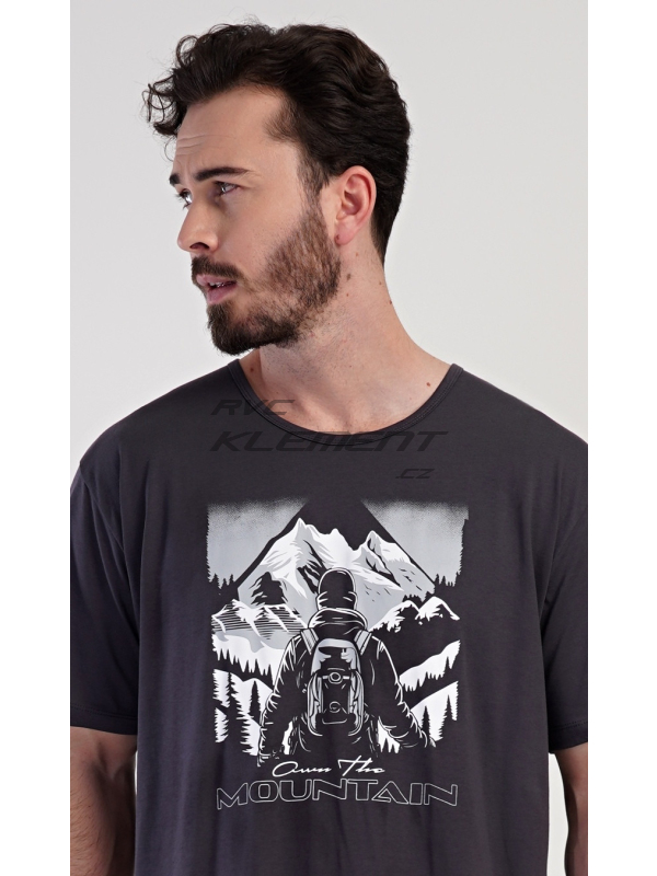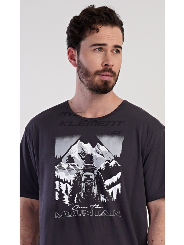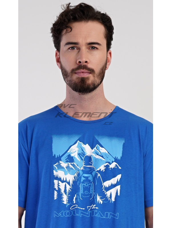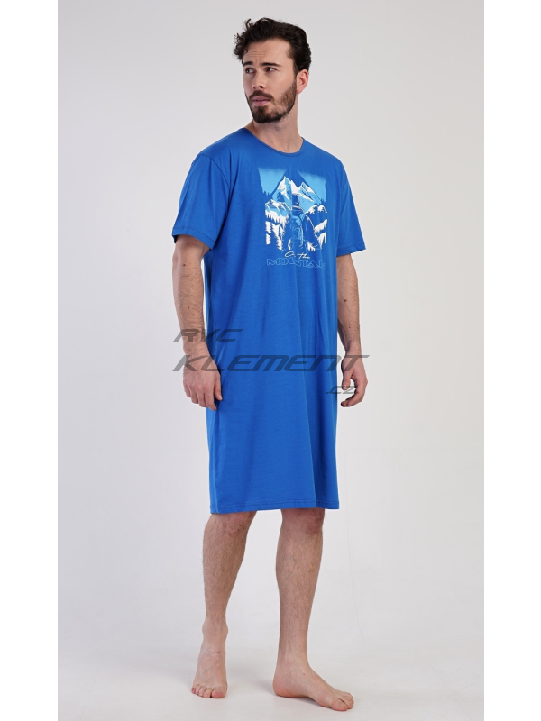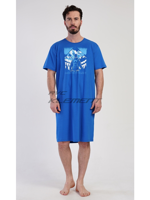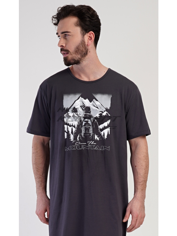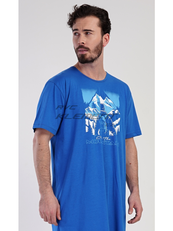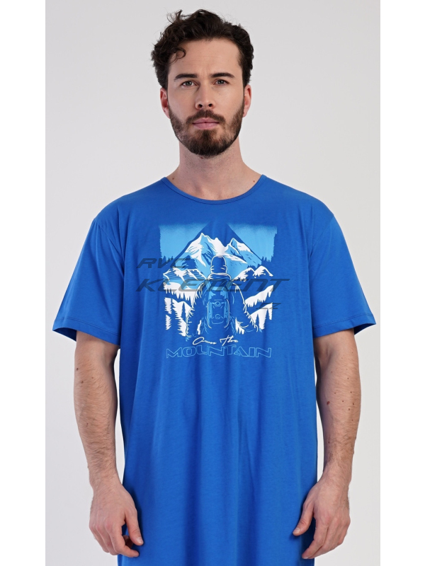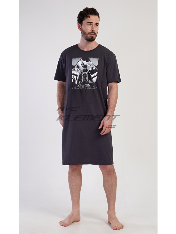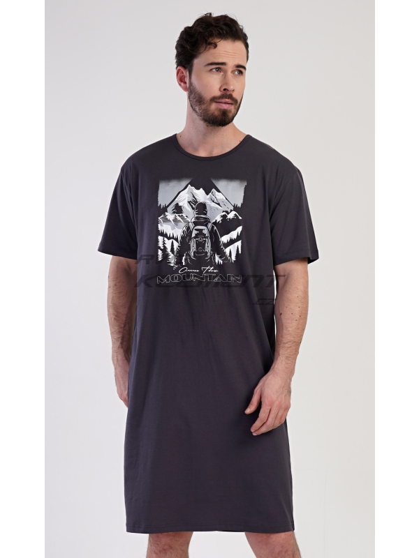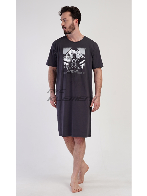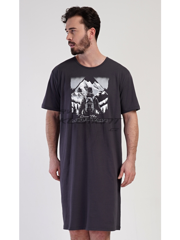 Pánská noční košile s krátkým rukávem Mountain. Pánská bavlněná noční košile s krátkým rukávem Mountain. Jednobarevná pánská noční košile s kulatým výstřihem je zdobena obrázkem muže, který jde zdolávat hory a nápisem ’Mountain’. Tato košile je vhodným dárkem pro všechny milovníky hor a turistiky. Použitý materiál je příjemný a poddajný na dotek. Obsah bavlny je 100%. Pokyny pro údržbu: - 100% bavlna Míry naměřené na výrobku:
