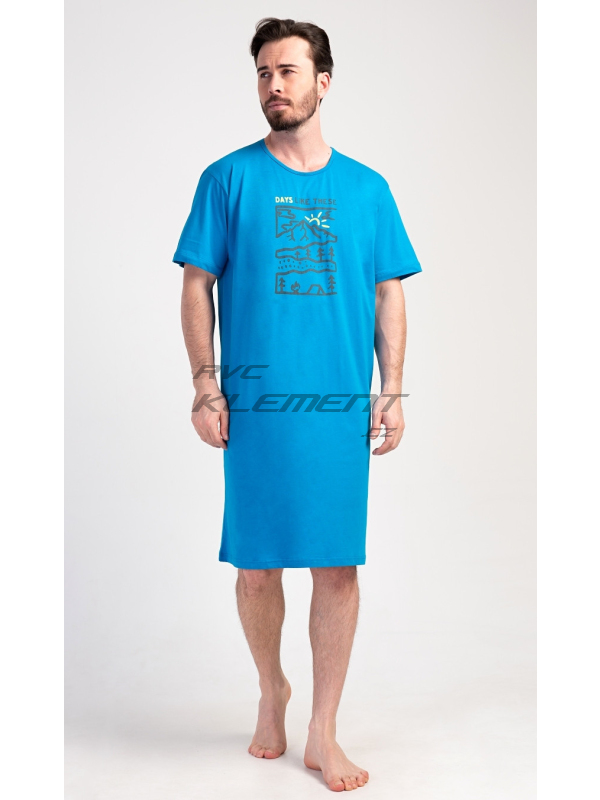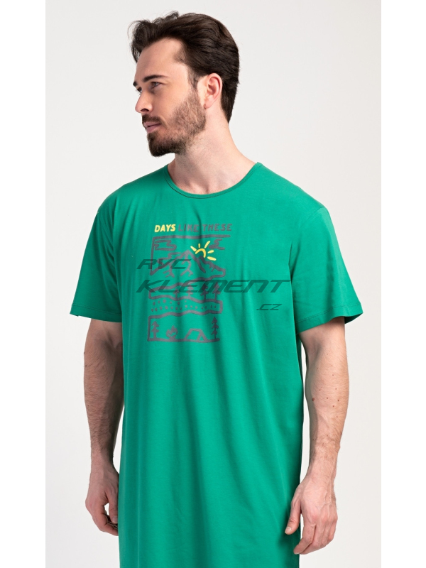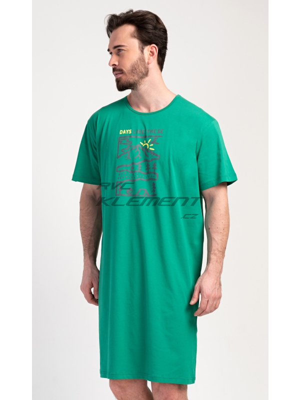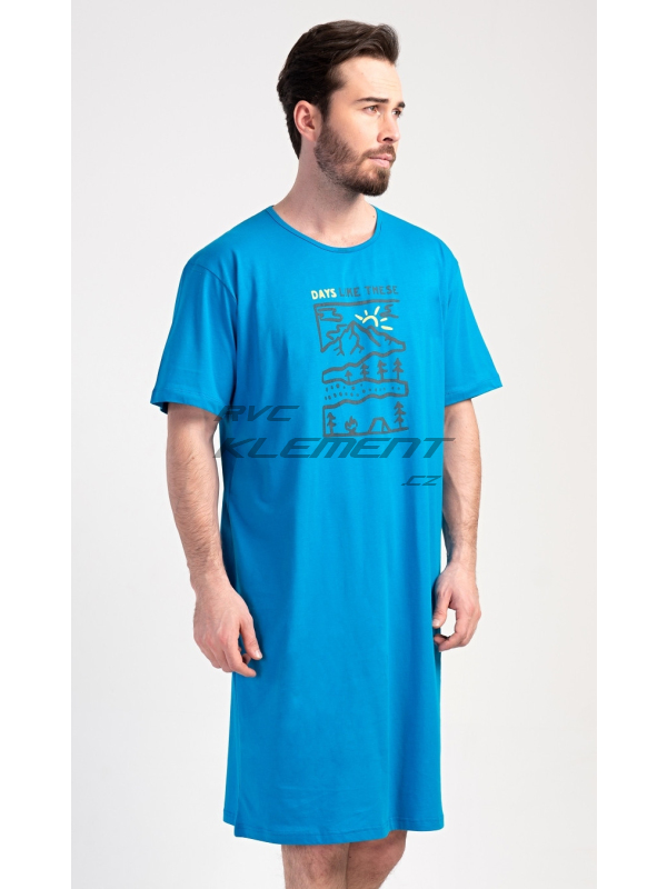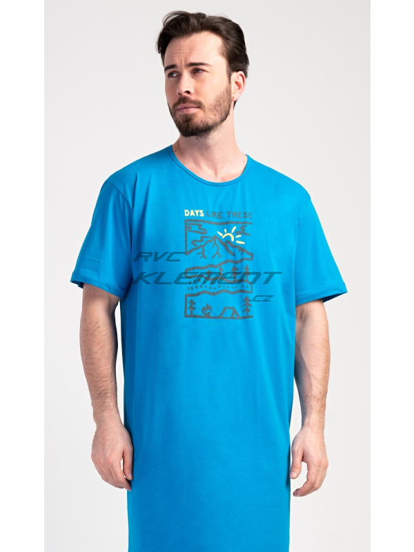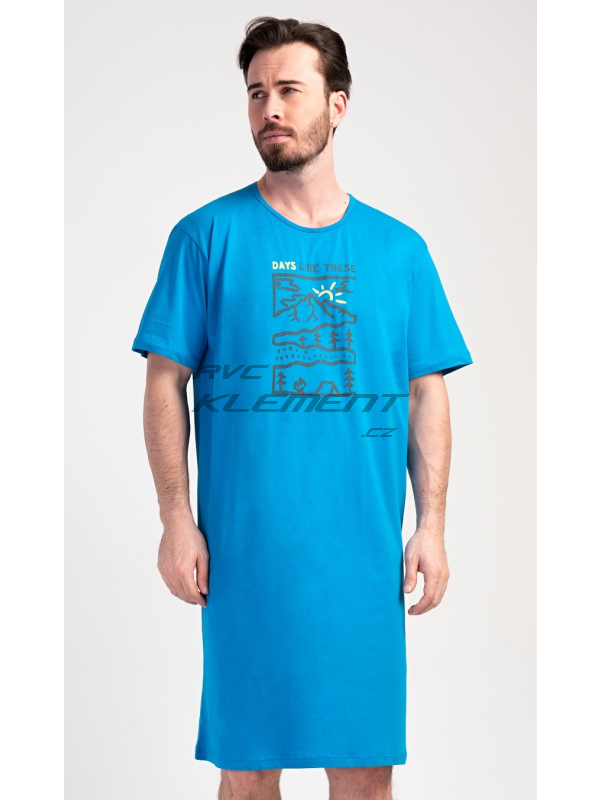 Pánská noční košile s krátkým rukávem Outdoor. Pánská bavlněná noční košile s krátkým rukávem Outdoor. Jednobarevná pánská noční košile s kulatým výstřihem má na hrudi obrázek lesnaté krajiny a nápis ’Days like these’. Tato košile je vhodným dárkem pro všechny milovníky turistiky. Použitý materiál je příjemný a poddajný na dotek. Obsah bavlny je 100%. Pokyny pro údržbu: - 100% bavlna Míry naměřené na výrobku: