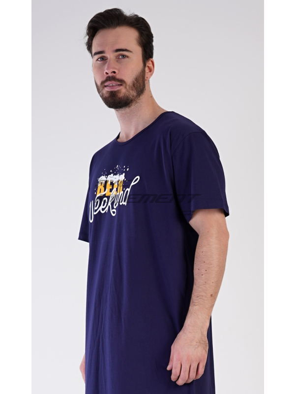 Pánská bavlněná noční košile s krátkým rukávem Beer weekend. Jednobarevná pánská noční košile s kulatým výstřihem a délkou po kolena má na hrudi nápis ’Beer weekend’. Tato košile je vhodným dárkem pro všechny milovníky piva. Použitý materiál je příjemný a poddajný na dotek. Obsah bavlny je 100%.