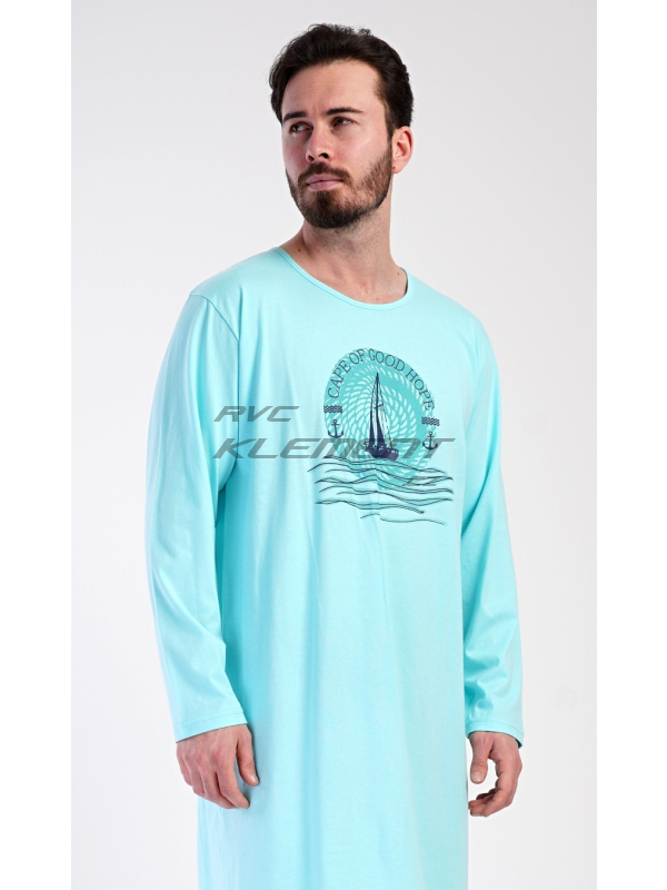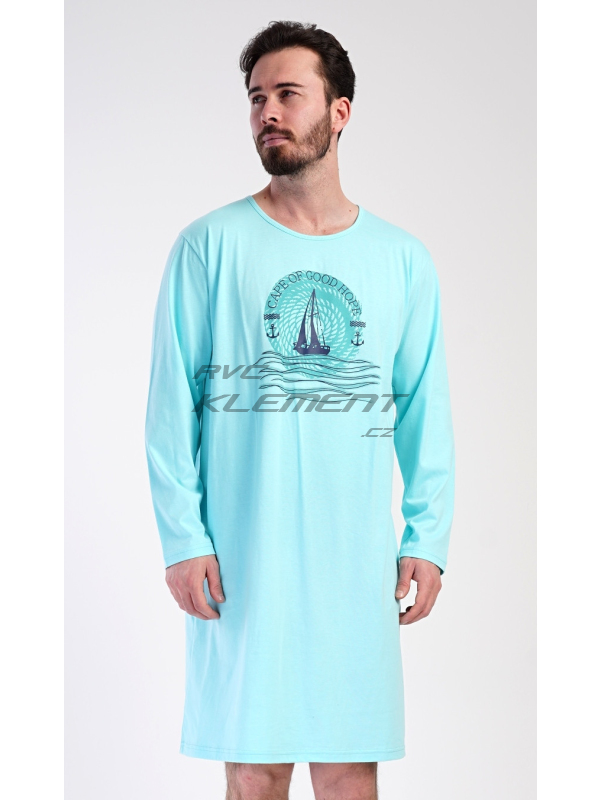 Pánská bavlněná noční košile s dlouhým rukávem Jachting. Jednobarevná pánská noční košile s kulatým výstřihem a délkou po kolena má na hrudi obrázek plachetnice a nápis ’Cape of good hope’. Noční košile je vhodným dárkem pro všechny milovníky moře a dálek. Použitý materiál s obsahem bavlny 100% je příjemný a poddajný na dotek.