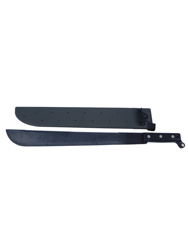 US Bolo mačeta. Čepel mačety je z kalené oceli, má navíc i pilku k řezání. Rukojeť a pouzdro je z tvrzeného plastu s pojistkou proti vyklouznutí s možností uchycení k opasku pomocí dvou kovových ok. Délka čepele: 45,5 cm, délka mačety: 59 cm | ||