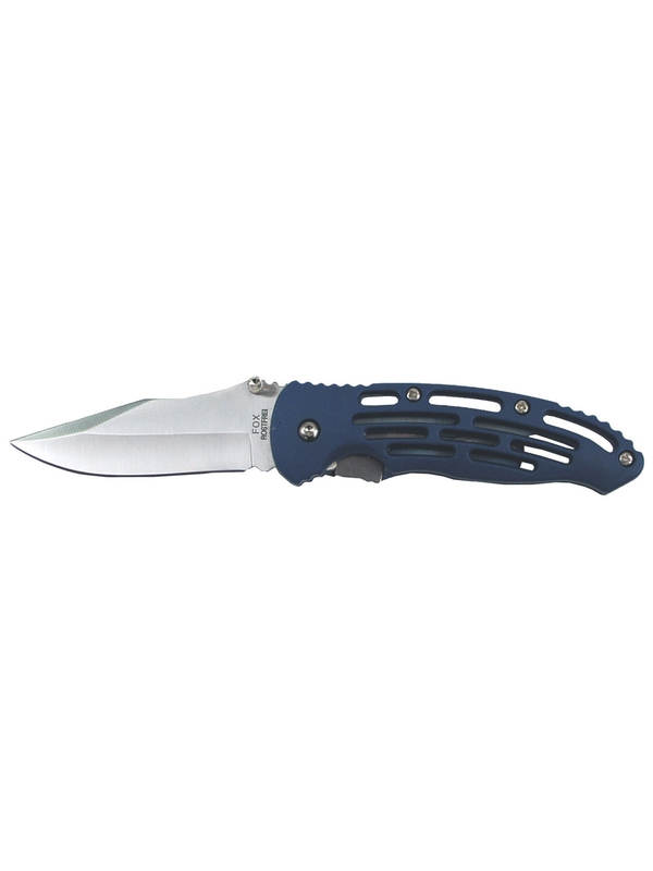 Zavírací nůž s drážkovanou štěrbinovou střenkou modré barvy, dá se otvírat jednou rukou. Celková délka: 20 cm, Délka čepele: 8,5 cm. | ||