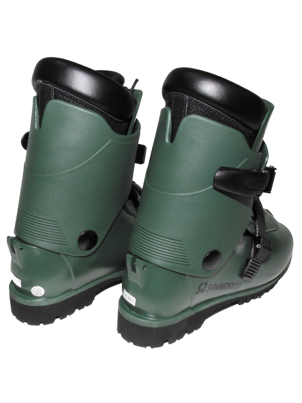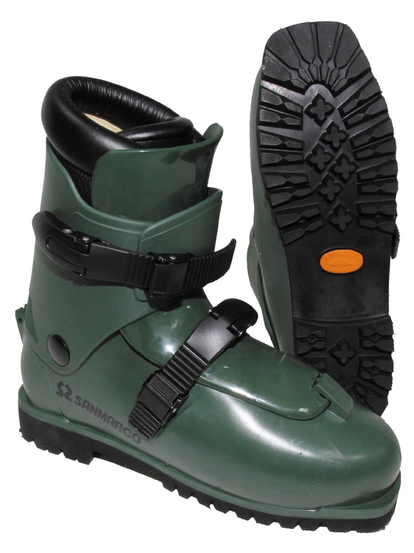 Touring lyžařské boty "Skywalk" S2 Sanmarco, v olivové barvě, velikost 9/43. Horolezecké boty pro vysokohorské výlety v zimě mají praktické přezky a skládací jazyk. Materiál - podšívka: kožené obložení, šněrovací vložka ze silné buněčné pěny, vhodné pro všechny typy stoupacích želez.