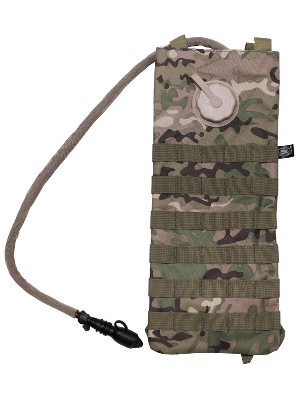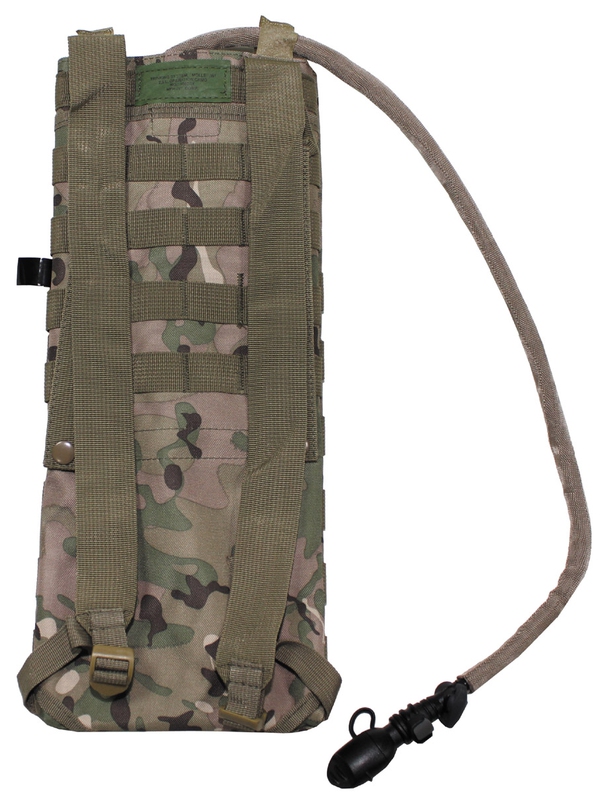 Hydratační balení MOLLE, 2,5 L, v designu operační camo, picí trubice s vyměnitelným náústkem a čepem, délka se upravuje díky nastavitelnému ramennímu popruhu, zadní díl s úložným prostorem, velikost: 46 x 18 x 2 cm, hmotnost: 470 g, materiál: 100% polyester.