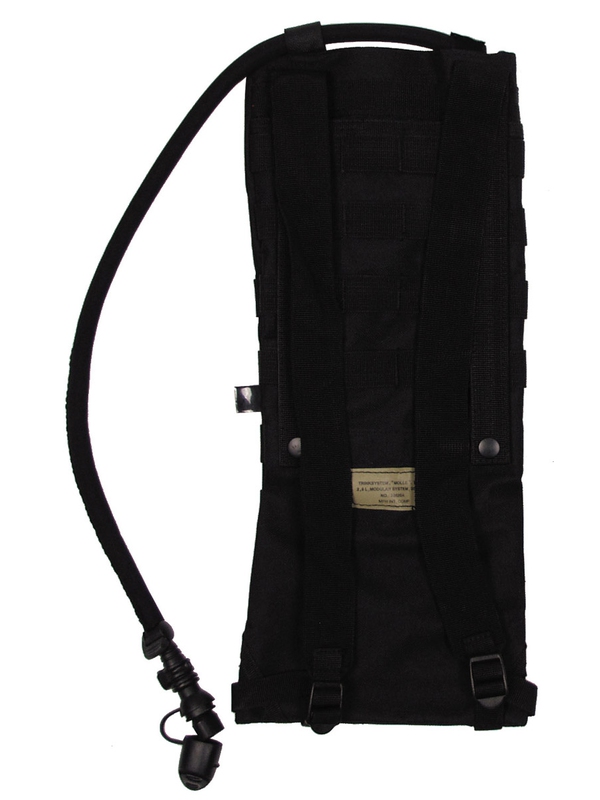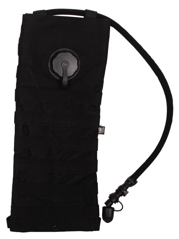 Nápojový batoh ”MOLLE”, 2,5 l, Modular System, černý. Vak slouží k přenášení vody, pomocí speciálního uzávěru jej lze využít nejen k pití, ale i např. k umývání či na vaření. Vaky na vodu s picím systémem Molle jsou s úspěchem používány po celém světě. Vak v černé barvě má nastavitelný ramenní popruh a vyměnitelný náústek na hadičce k pití, objem: vnitřního vaku na vodu 2,5 l. Nápojový batoh s plastikovým rezervoárem tekutin má hadičku na pití za pochodu. Rozměry: 46 x 18 x 2 cm,. Hmotnost: 470 g. Materiál: 100% polyester.