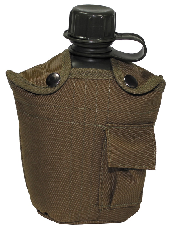 Originál US plastová láhev v nylonovém pouzdře v designu coyote, 1 litr. Nylonový obal s malou vnější kapsou, dva držáky pro upevnění na opasek, pásek nebo batoh. | ||