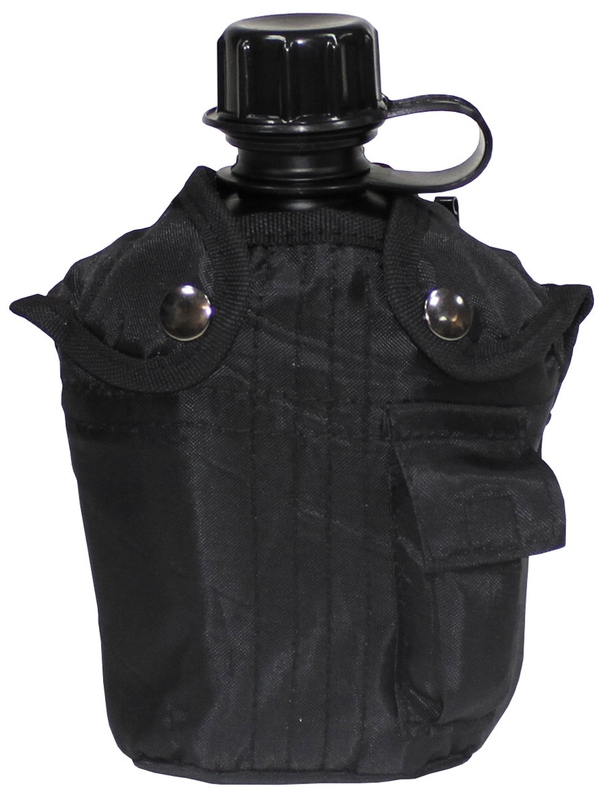 US plastová butela v černém nylonovém obalu. Litrová láhev má na krytě malou vnější kapsu a dva držáky pro uchycení na batoh nebo opasek. | ||