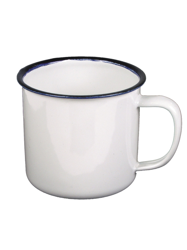 Plechový polní hrnek v bílé barvě smaltování s modrým lemem, obsah 0,3 l, průměr 8 cm. | ||