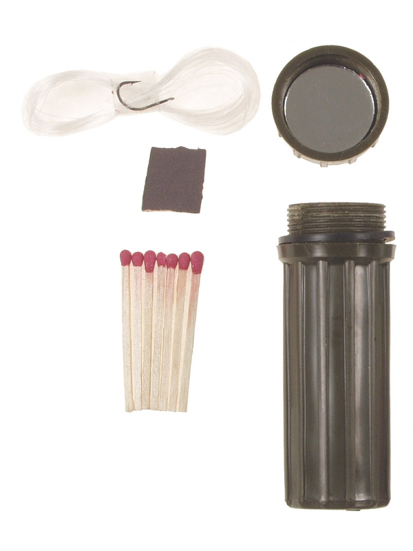Vodotěsné krabička zápalek, olivová Vodotěsná krabička s potřebami pro nouzové přežití. Krabička obsahuje zápalky, škrtátko, vlasec s rybářským háček a signální zrcátko. Barva krabičky: olivově zelená. Velikost: výška 7,5cm průměr 2,5m | ||