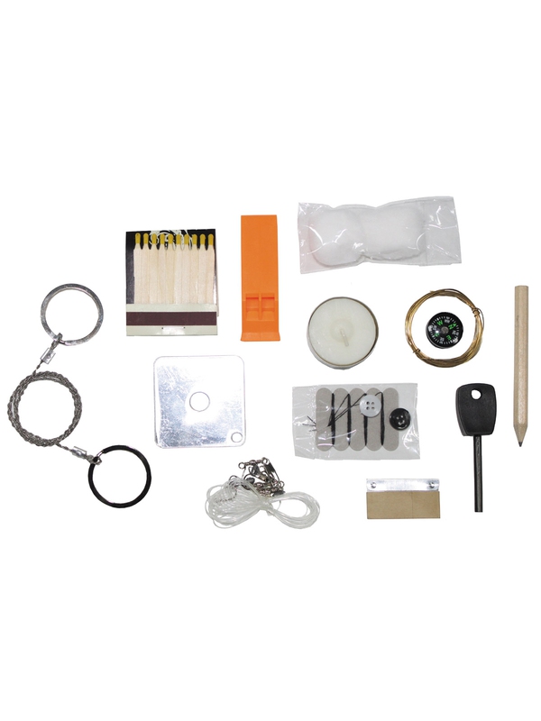 Vodotěsný box pro přežití. Obsah: rám lanové pily, drát, rybářský háček, bavlna, zápalky, svíčka, tužka, mini kompas, šití, zapalovače, řezací nože, zrcadlo, průvodce přežití. Rozměry: 13,5 x 8 x 4 palce. Poznámka: použité zboží