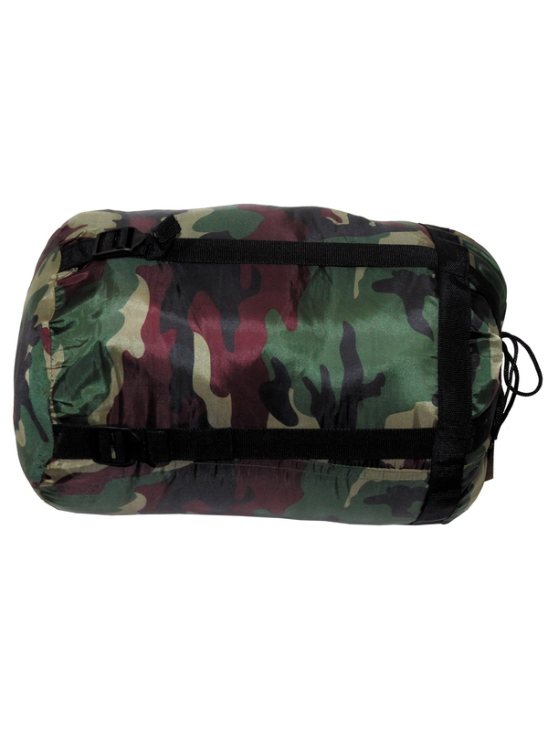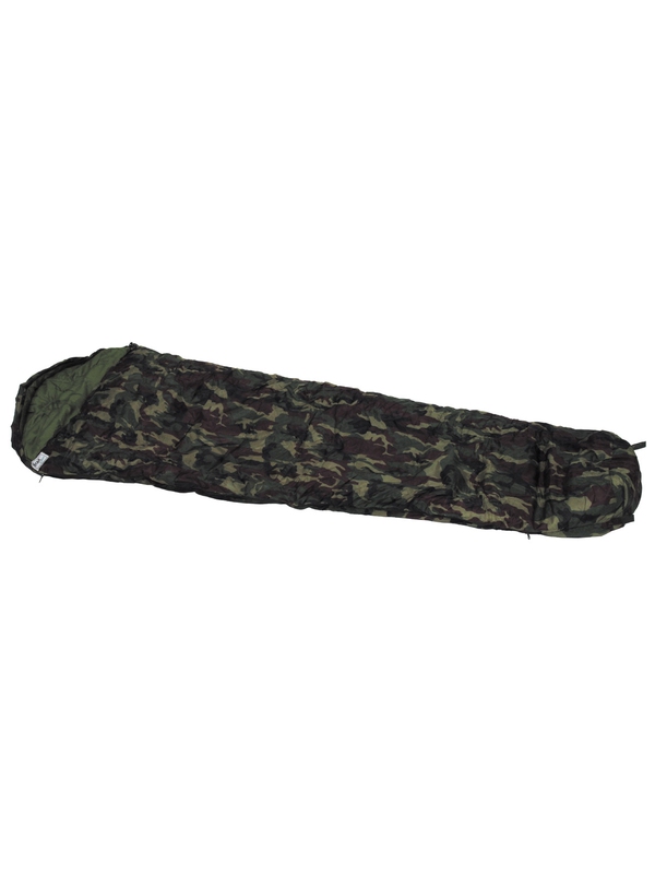 Mumie spacák, v designu woodland, 2LG. s polyesterovou výplní 450g/qm. Dvouvrstvý spacák s hlavou má hmotnost: 1950 g, rozměry: 220 x 50 x 75 cm, velikost balení: délka 40 cm, průměr 25 cm, materiál: 100% polyester, podšívka: 100% bavlna, nplň: 2 x 225 g / m² dutých vláken / polyester.