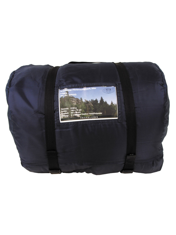 Izraelský pilotnít spacák, v modré barvě. Dvouvrstvý spacák, váha: 1800 g, rozměry: 190 x 75 cm, čelo: 30 x 40 cm, velikost balení: délka 40 cm, průměr 25 cm, materiál: 100% polyester, podšívka: 100% bavlna, náplň: 2 x 200 g / m² dutých vláken / polyester.