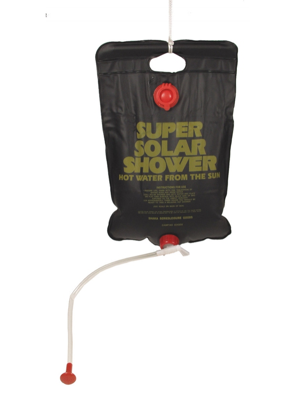 Solární sprcha - závěsná o obsahu 10 litrů. Vak sednoduše naplní vodou, nechá se vystavený slunečnímu záření a poté už se dá komfortně osprchovat teplou vodou, což je v polních podmínkách luxusní záležitost. | ||
