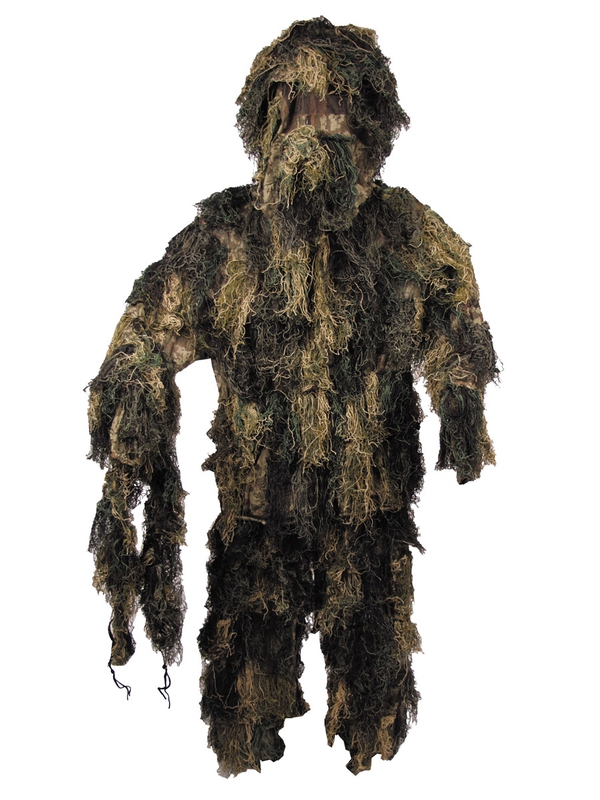Čtyřdílný maskovací převlek "Ghillie Suit" - v designu woodland. Kvalitní maskovací převlek vhodný pro lovce, snipery i hráče paintballu s třásněmi je z odolného 100%ního polyesteru zpomalujícího hoření. Soupravu tvoří bunda, kalhoty, čepice a kryt pistole, bunda má zapínání na druky, elastickou nastavitelnou šňůrku u kalhot v pase, pružné manžety, klobouk s otvorem pro oči, a kryt pistole s gumičkou.