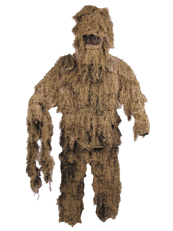 Čtyřdílný maskovací převlek "Ghillie Suit" - v designu desert. Kvalitní maskovací převlek vhodny pro lovce, snipery i hráče paintballu s třásněmi je z odolného 100%ního polyesteru zpomalujícího hoření. Soupravu tvoří bunda, kalhoty, čepice a kryt pistole, bunda má zapínání na druky, elastickou nastavitelnou šňůrku u kalhot v pase, pružné manžety, klobouk s otvorem pro oči, a kryt pistole s gumičkou.