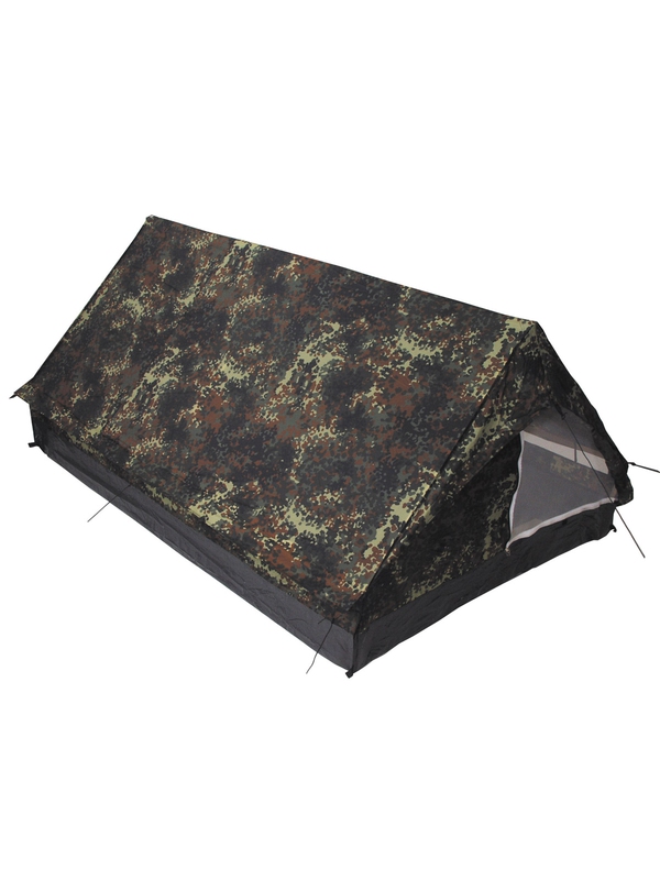 Stan, "Minipack" v designu flecktarn ve velikossti 213 x 137 x 97 cm. Stabilní a lehky stan pro 2 osoby s moskytiérou u vchodu je z materiálu potaženého 190T nylonem PU má jednoduché stěny, podlahu z odolné PU tkaniny, kovové tyčky a ocelové kolíky. Součástí je obal na stan v balení: 55 x 12 x 12 cm, hmotnost: 1850 g.