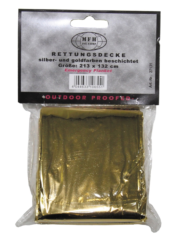 Nouzová přikrývka, lehká a snadno složitelná ALU fólie, udržuje tělesné teplo do příchodu pomoci. Stříbrná a zlatá. | ||
