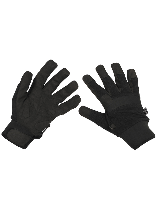 Rukavice černé "Security" z neoprenu se vyznačují perfektním střihem a provedením. Hřbet a prsty jsou zesíleny pro lepší absorbci nárazu nebo proti prořezu či probodnutí. Bezpečnostní rukavice ze syntetické kůže, v kombinaci spandexu a neoprenu mají elastický popruh na zápěstí pro utažení se suchým zipem.