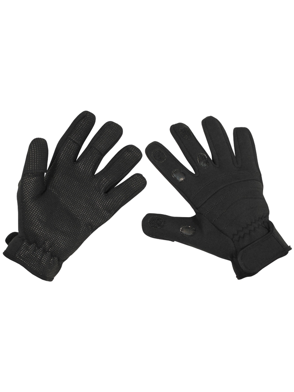 Rukavice ”Combat”, neopren, černé. Velmi kvalitní security rukavice, vyrobené z neoprenu s vnější ochranou kloubů prstů, elastický pásek k utažení na suchý zip, materiál 9 0% neopren, 5 % nylon, 5 % polyester.