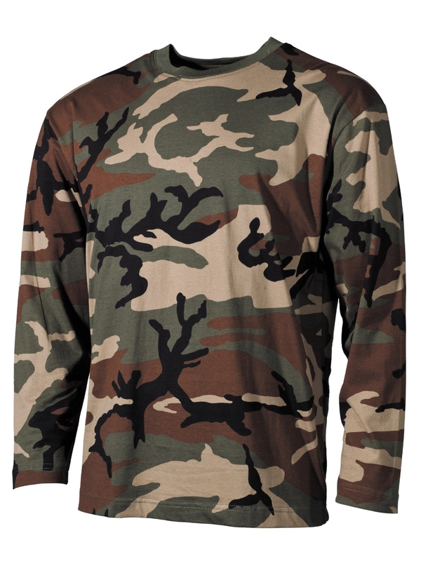 USA maskovací tričko s dlouhým rukávem vzor woodland, 160g/mĂ ˝, zesílené u krku. Materiál: 100% bavlna. | ||