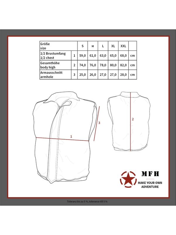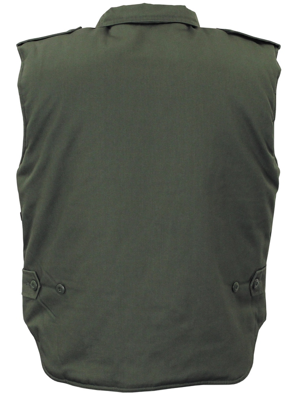 US prošívaná vesta Ranger, olivová, s nápletem do pasu. Klasická prošívaná vesta s bavlněnou podšívkou a mnoha kapsami, čtyři našité s klopami, jednu malou na náprsní kapse, a dvě boční kapsy. Vesta je propínací na zip se širokým nastavitelným pasem. Materiál: vrchní: 65% polyester, 35% bavlna, podšívka: 100% bavlna, výplň: 100% polyester.