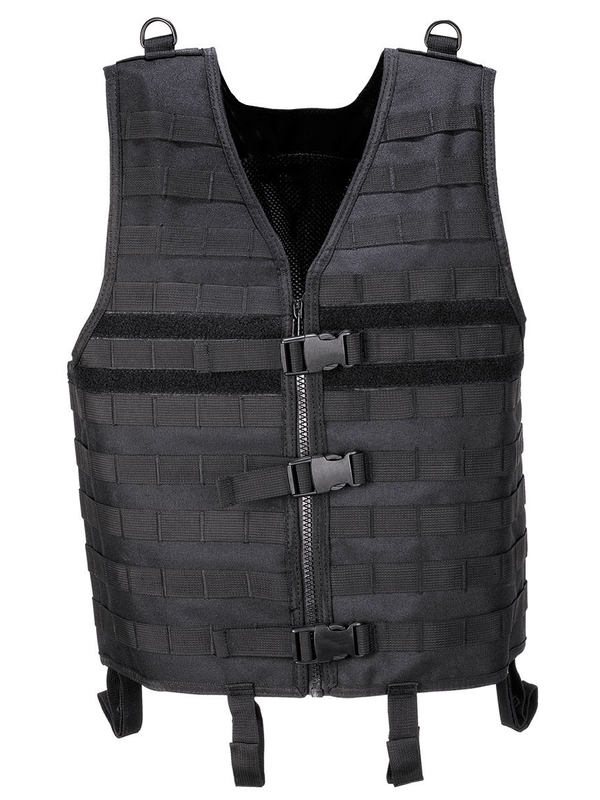 Taktická vesta Molle Light, černá má nastavitelná ramena a postranní část, jednu velkou posuvnou kapsu se zipem a jednu postranní kapsu na robustním síťovém materiálu. Nastavitelné zapínací pásky, pod nimi zapínání zipem. Materiál" 100% Polyester.