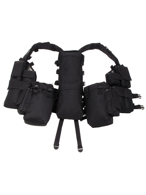 Taktická vesta s mnoha kapsami v černé barvě. Vesta má 12 kapes, nastavitelné polstrované ramenní popruhy a poutka, materiál: nylon. | ||