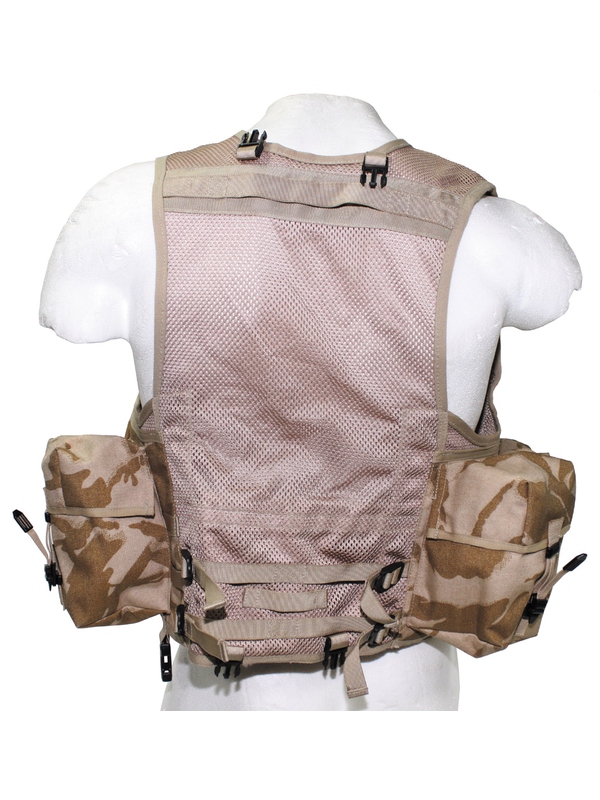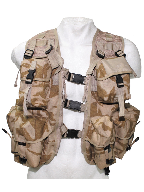 Originál britská taktická vesta, DPM desert, nastavitelná, mesh vložky, 8 kapes se zapínáním na vnější straně, 2 boční kapsy na zip.
