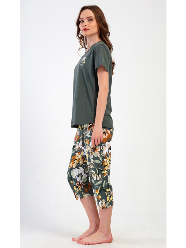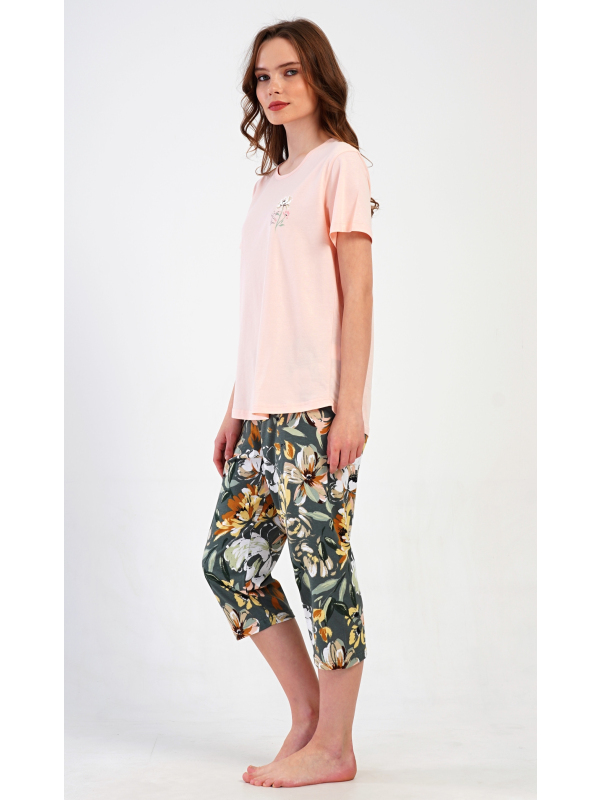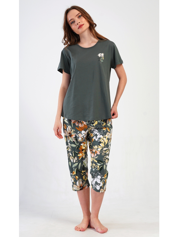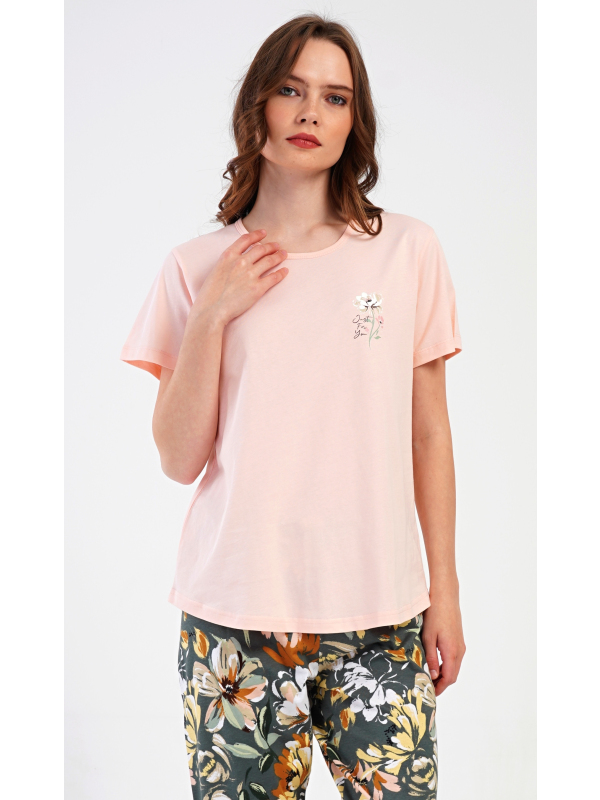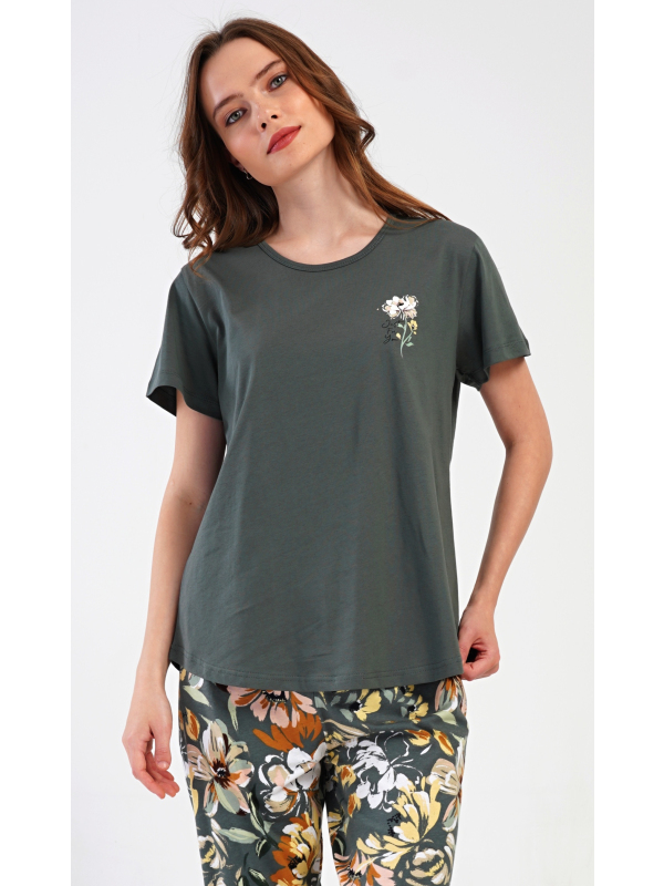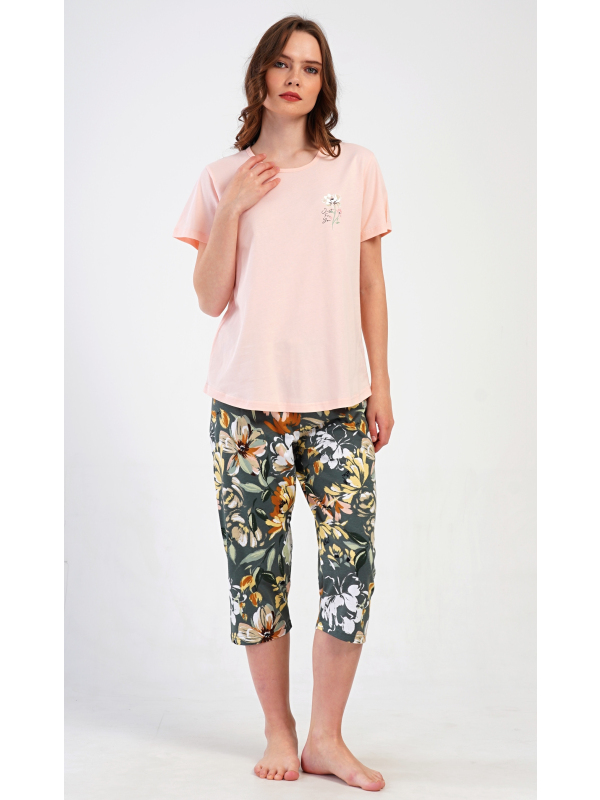Dámské kapri pyžamo Marie. Dámské bavlněné kapri pyžamo Marie. Dámské pyžamo se skládá z trička s krátkým rukávem a tříčtvrtečních kalhot. Tričko s kulatým výstřihem má na hrudi obrázek květu. Tento motiv se opakuje i na kalhotách, které mají v pase gumu a šňůrku na stažení, jsou bez kapes. Použitý bavlněný materiál je příjemný a poddajný na dotek. Pokyny pro údržbu: - 100% bavlna Míry naměřené na výrobku