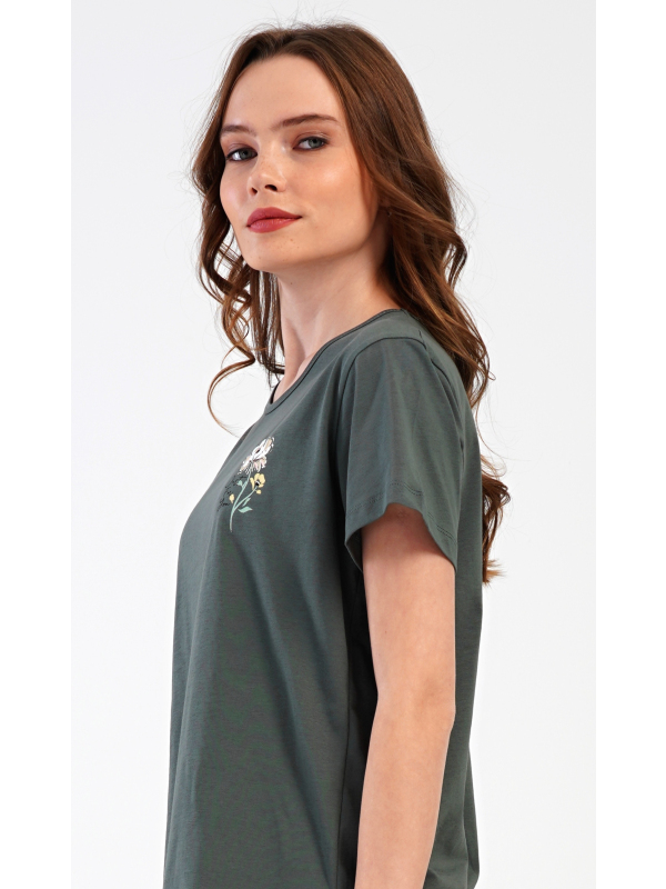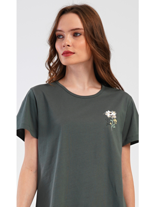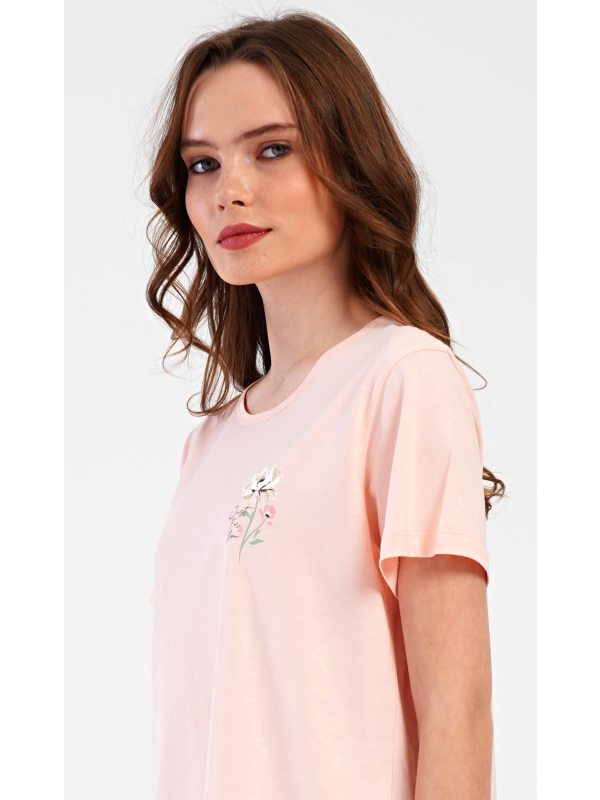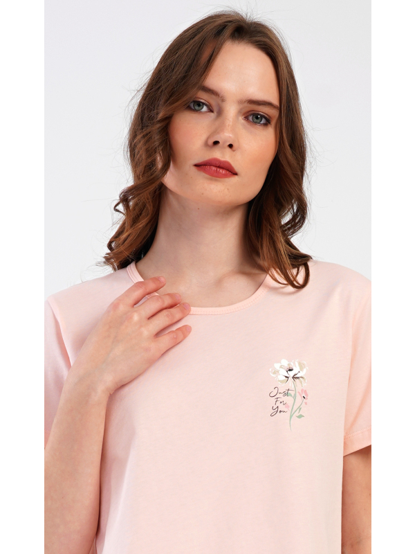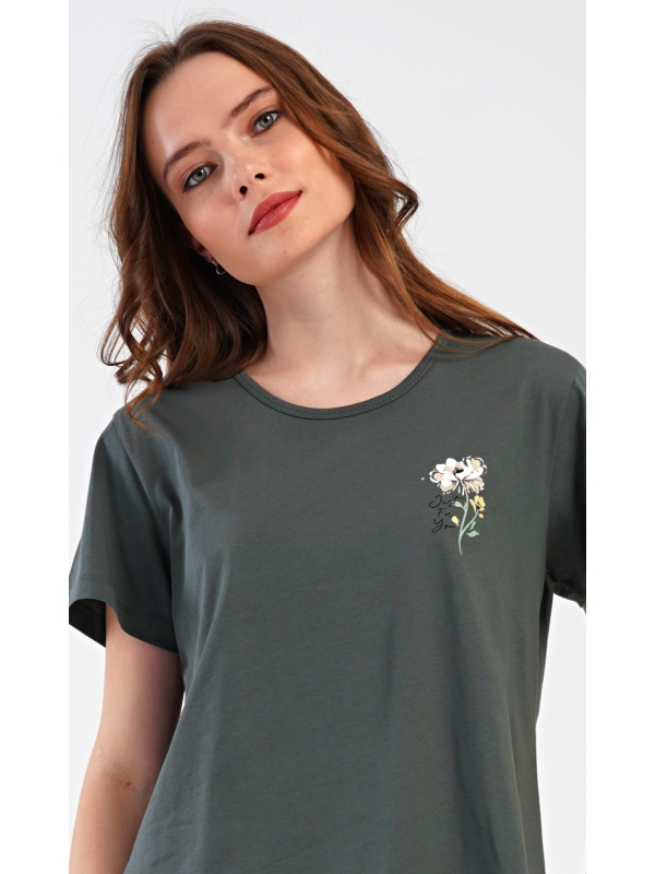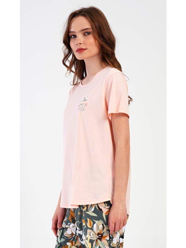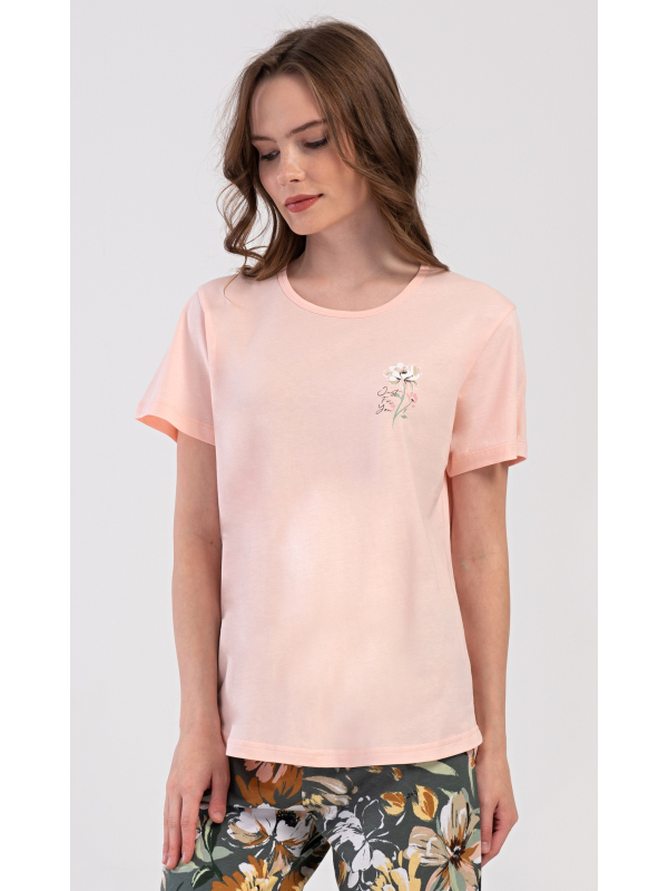 Dámské kapri pyžamo Marie. Dámské bavlněné kapri pyžamo Marie. Dámské pyžamo se skládá z trička s krátkým rukávem a tříčtvrtečních kalhot. Tričko s kulatým výstřihem má na hrudi obrázek květu. Tento motiv se opakuje i na kalhotách, které mají v pase gumu a šňůrku na stažení, jsou bez kapes. Použitý bavlněný materiál je příjemný a poddajný na dotek. Pokyny pro údržbu: - 100% bavlna Míry naměřené na výrobku