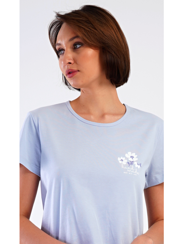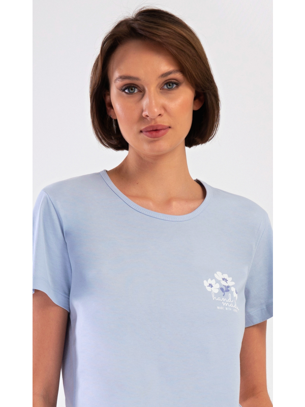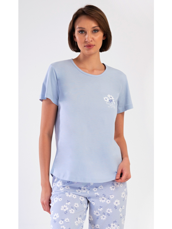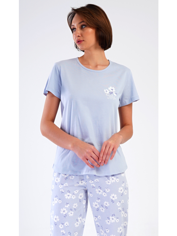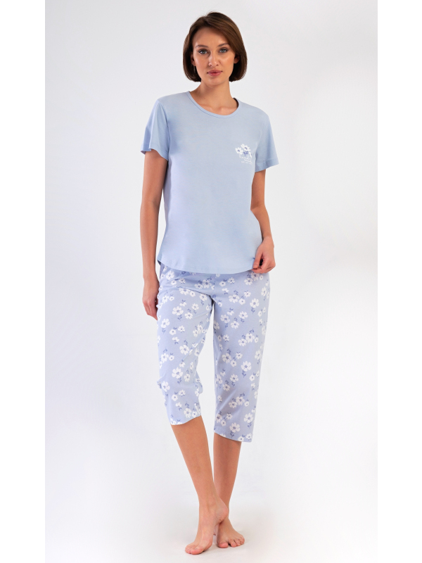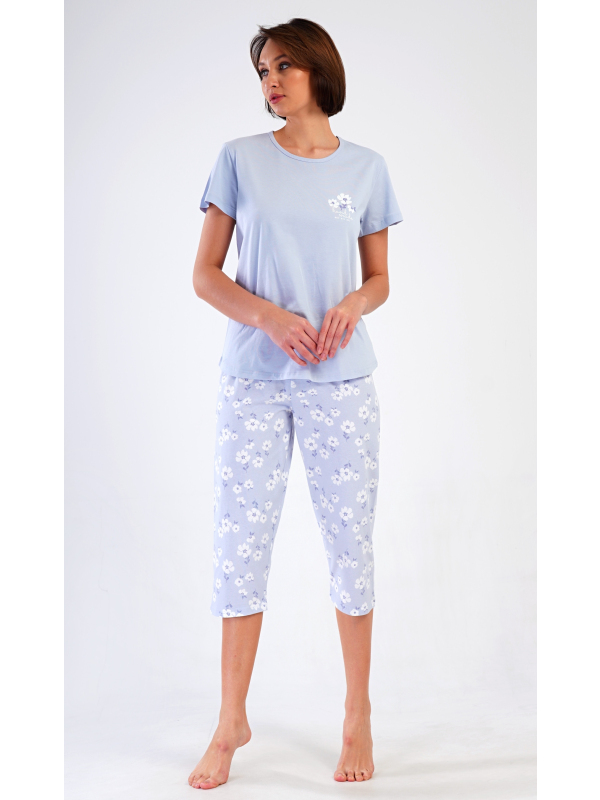Dámské kapri pyžamo Nature. Dámské bavlněné kapri pyžamo Nature. Dámské pyžamo se skládá z trička s krátkým rukávem a tříčtvrtečních kalhot. Tričko s kulatým výstřihem má na hrudi obrázek květu. Tento motiv se opakuje i na kalhotách, které mají v pase gumu a šňůrku na stažení, jsou bez kapes. Použitý bavlněný materiál je příjemný a poddajný na dotek. Pokyny pro údržbu: - 100% bavlna Míry naměřené na výrobku: