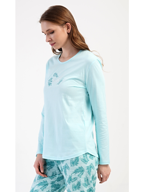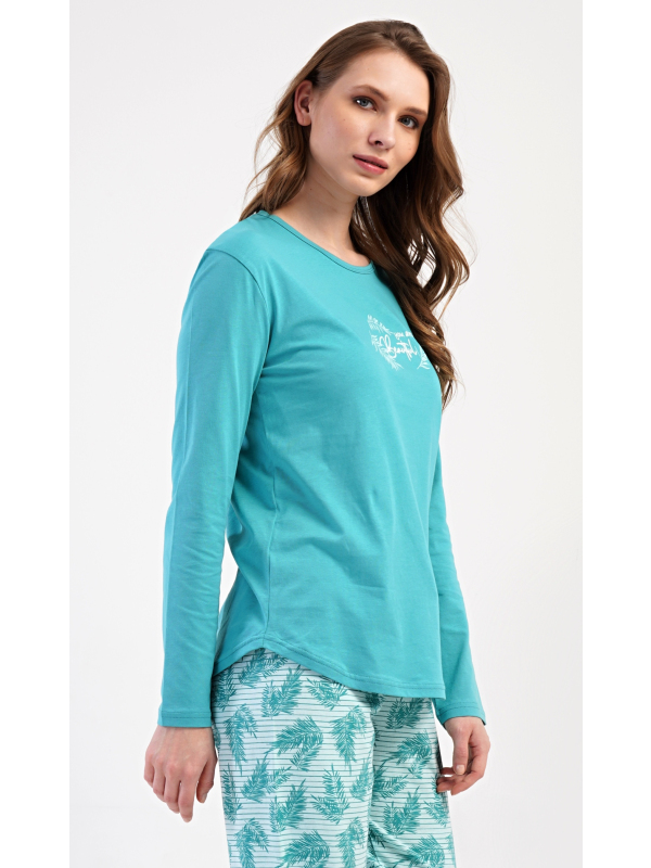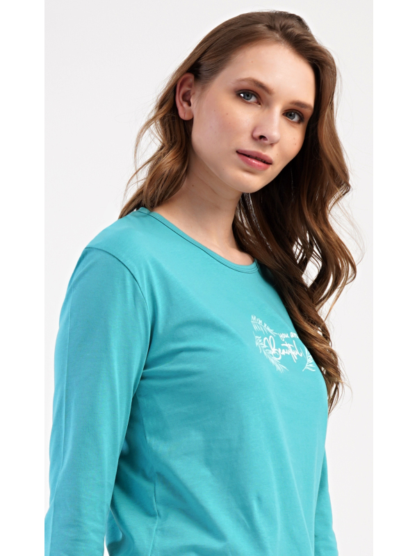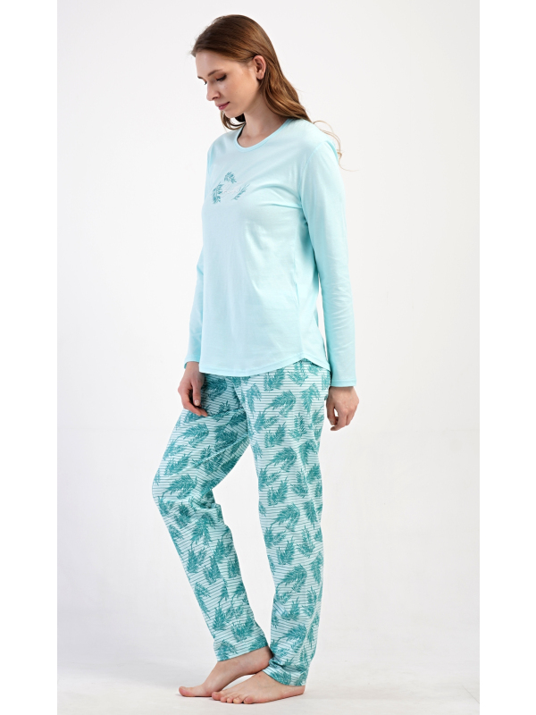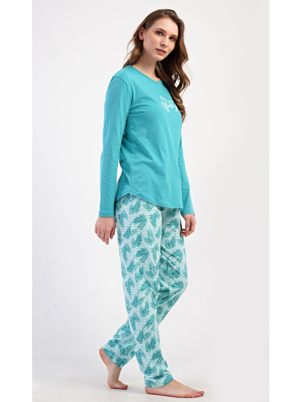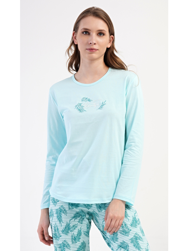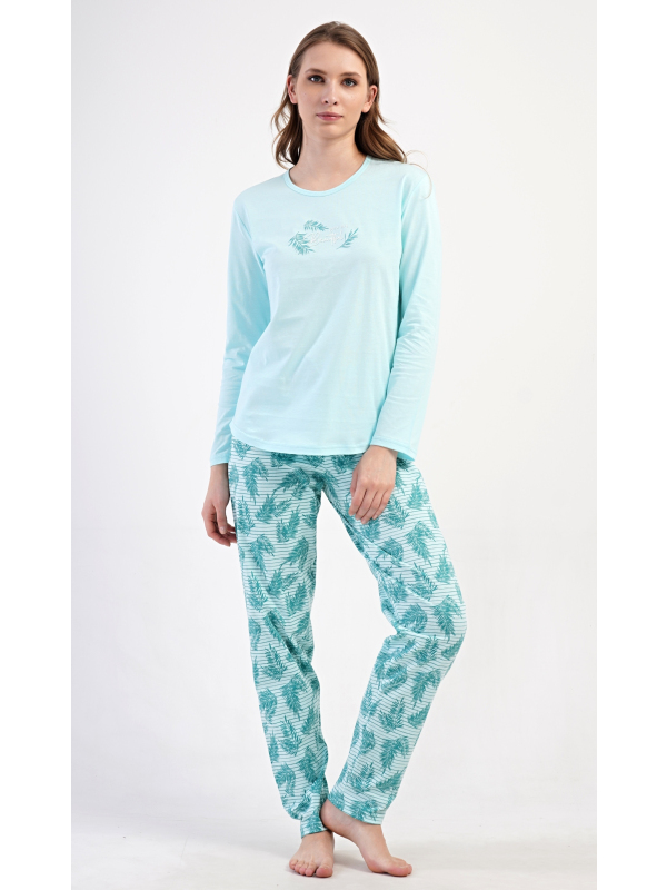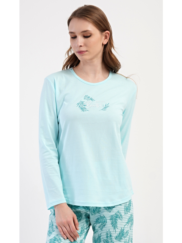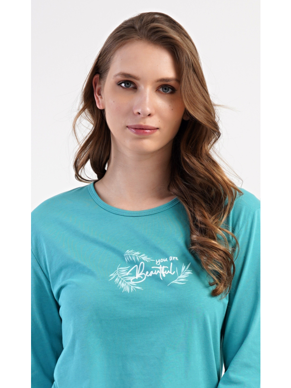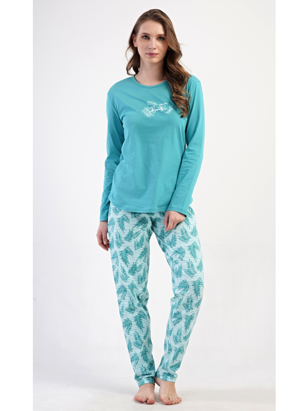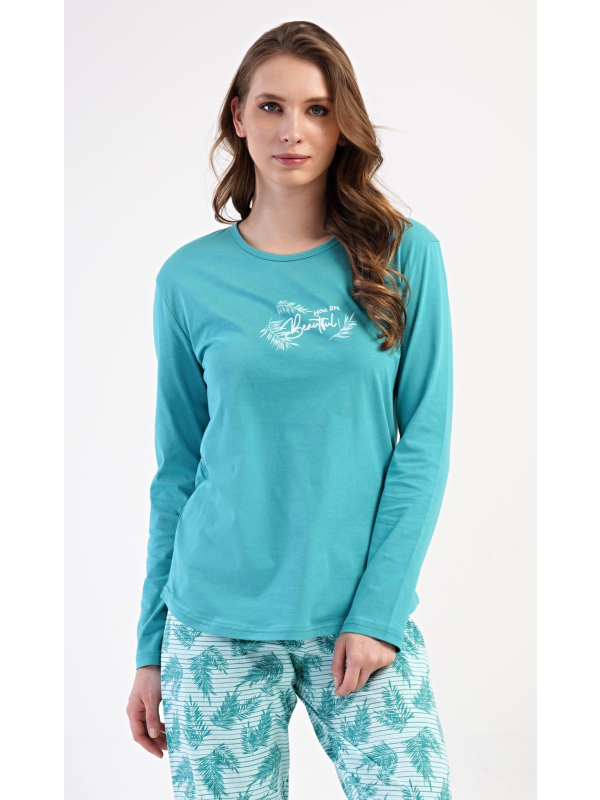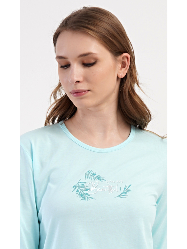 Dámské pyžamo s dlouhým rukávem Denisa. Dámské bavlněné dlouhé pyžamo Denisa. Dámské pyžamo se skládá z trika s dlouhým rukávem a dlouhých kalhot. Triko je jednobarevné, zdobené na hrudi drobným obrázkem větviček a nápis ’You are beautiful’. Motiv větviček se opakuje i na kalhotách, které mají v pase gumu a šňůrku na stažení, nemají kapsy. Použitý bavlněný materiál je poddajný a příjemný na dotek. Pokyny pro údržbu: -100 % bavlna Míry naměřené na výrobku: