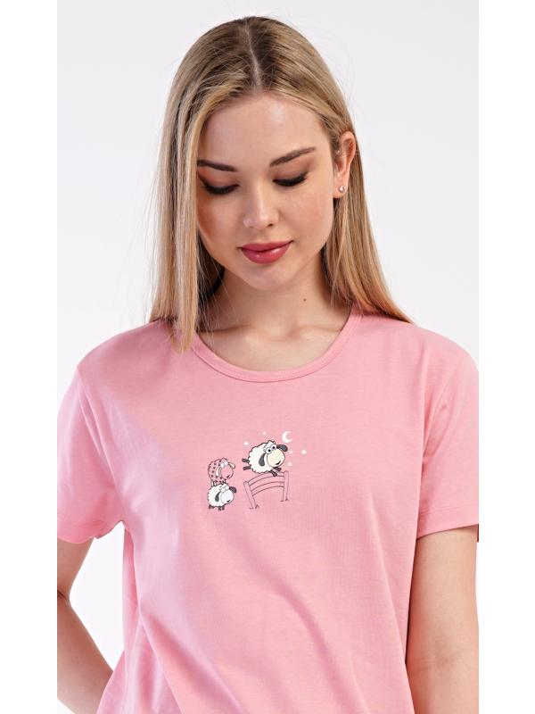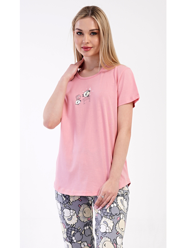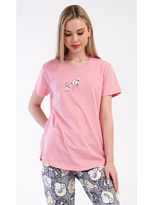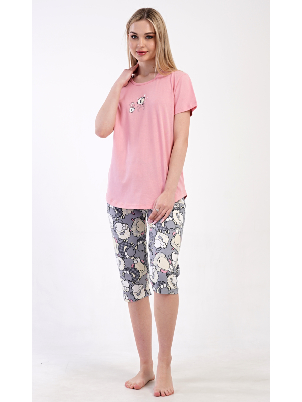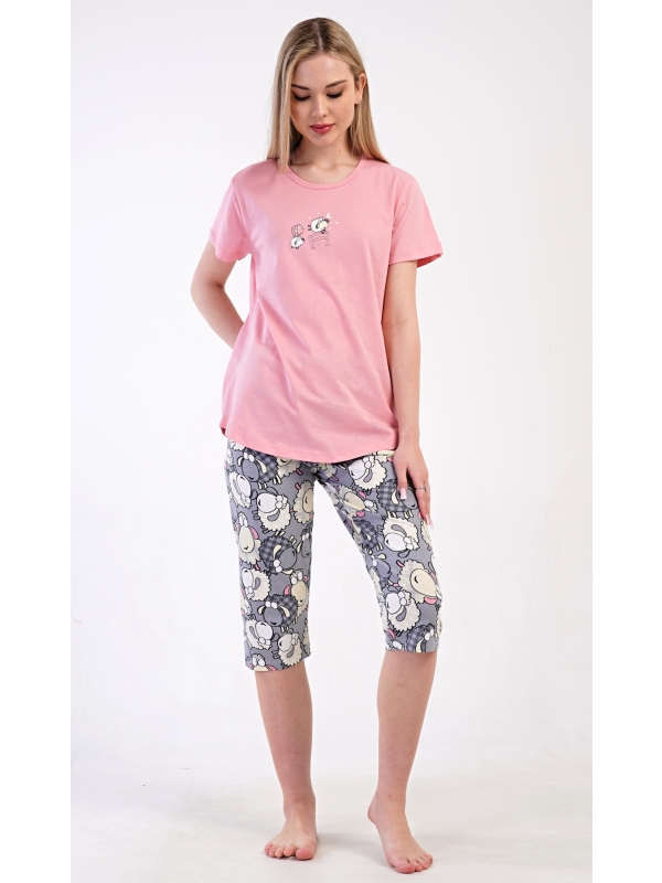 Dámské kapri pyžamo Ovečka. Dámské bavlněné kapri pyžamo Ovečka. Dámské pyžamo se skládá z trička s krátkým rukávem a tříčtvrtečních kalhot. Tričko s kulatým výstřihem zdobí obrázek roztomilých oveček. Potisk s motivem oveček se opakuje i na kalhotách, které mají v pase gumu a šňůrku na stažení, jsou bez kapes. Použitý bavlněný materiál je příjemný a poddajný na dotek. Pokyny pro údržbu: - 100% bavlna Míry naměřené na výrobku: