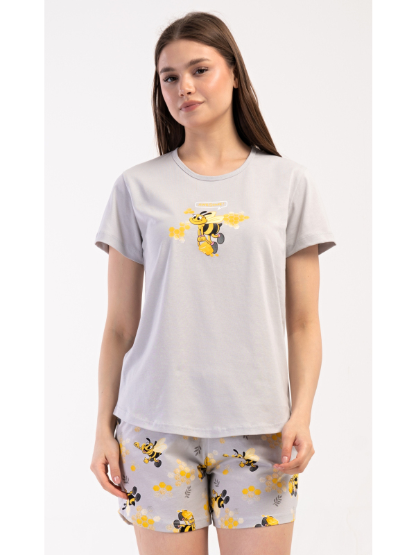 Dámské bavlněné šortkové pyžamo Včelky. Dámské pyžamo se skládá z trička s krátkým rukávem a šortkových kalhot. Jednobarevné tričko zdobí obrázek včelky. Stejný motiv se opakuje i na šortkách, které mají v pase gumu a šňůrku na stáhnutí, jsou bez kapes. Použitý bavlněný materiál je příjemný a poddajný na dotek.