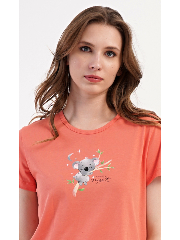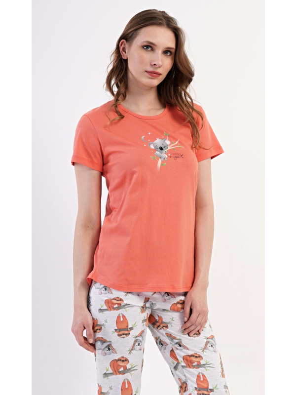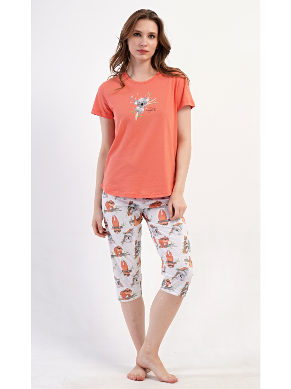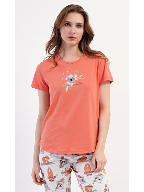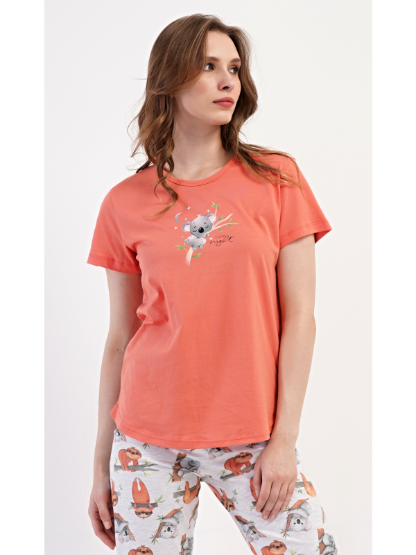 Dámské kapri pyžamo Koala. Dámské kapri pyžamo Koala. Dámské pyžamo se skládá z trička s krátkým rukávem a tříčtvrtečních kalhot. Tričko s kulatým výstřihem zdobí na hrudi obrázek koaly. Tento motiv se opakuje i na kalhotách, které mají v pase gumu a šňůrku na stažení, jsou bez kapes. Použitý bavlněný materiál je příjemný a poddajný na dotek. Obsah bavlny u trička je 100% a u kalhot 70%. Pokyny pro údržbu: - 100% bavlna Míry naměřené na výrobku: