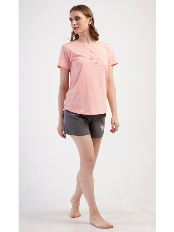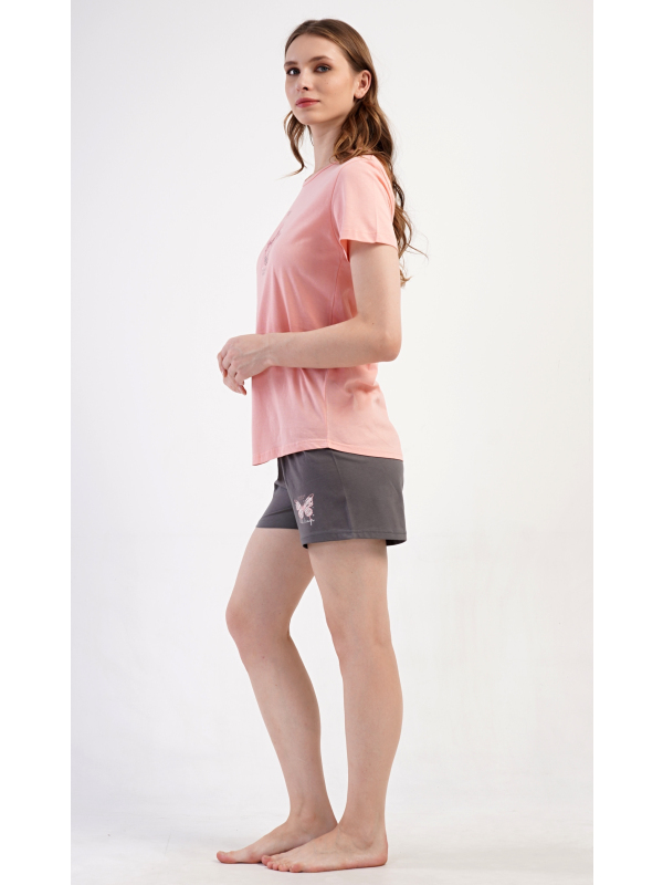 Dámské bavlněné šortkové pyžamo Motýlci. Dámské pyžamo se skládá z trička s krátkým rukávem a šortkových kalhot. Jednobarevné tričko zdobí obrázek motýlků. Stejný motiv se opakuje i na šortkách, které mají v pase gumu a šňůrku na stáhnutí, jsou bez kapes. Použitý bavlněný materiál je příjemný a poddajný na dotek.