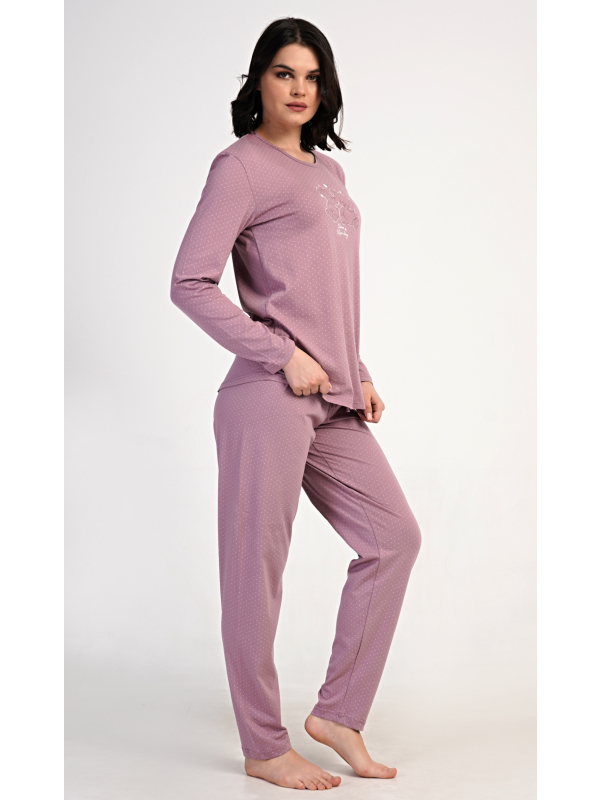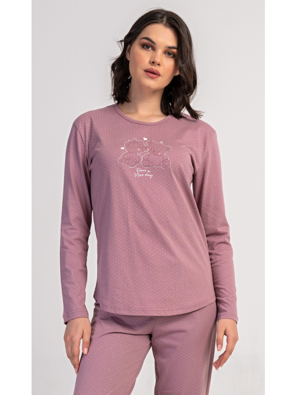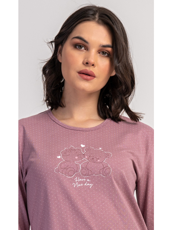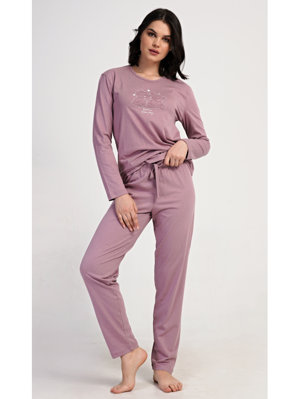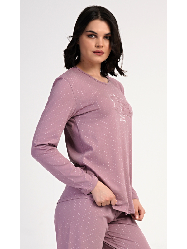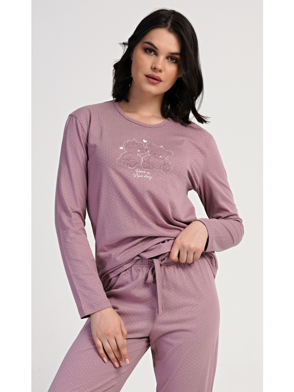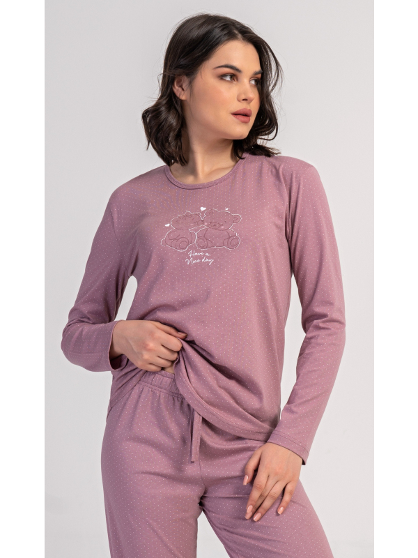 Dámské bavlněné dlouhé pyžamo Emily. Dámské bavlněné dlouhé pyžamo Emily. Dámské pyžamo se skládá z trika s dlouhým rukávem a dlouhých kalhot. Triko je potištěno puntíky a zdobené obrázkem dvou medvídků. Potisk puntíků se opakuje i na kalhotách, které mají v pase gumu a šňůrku na stažení, nemají kapsy. Použitý bavlněný materiál je poddajný a příjemný na dotek. Pokyny pro údržbu: - 100% bavlna Míry naměřené na výrobku: