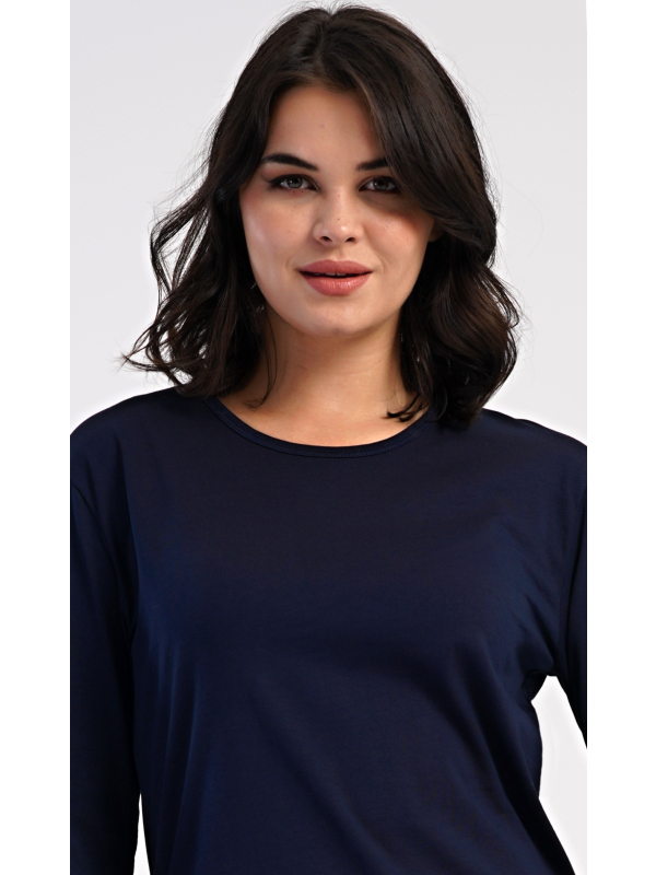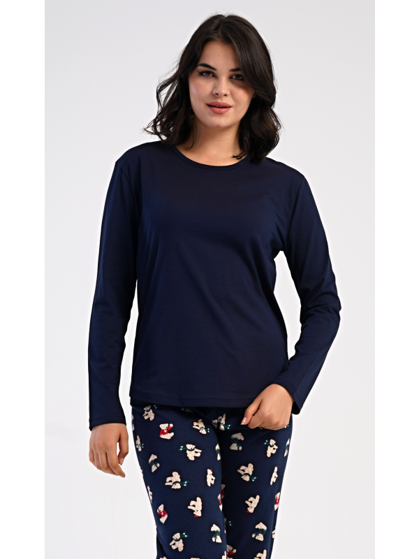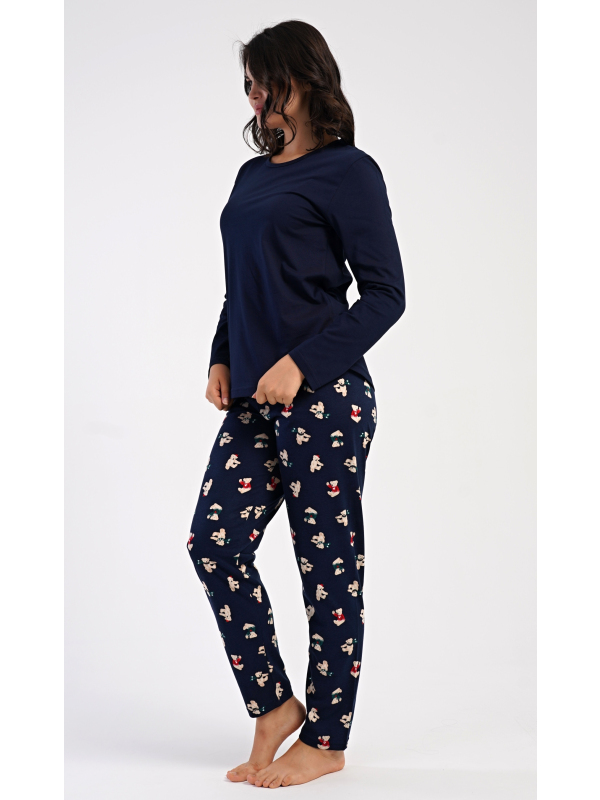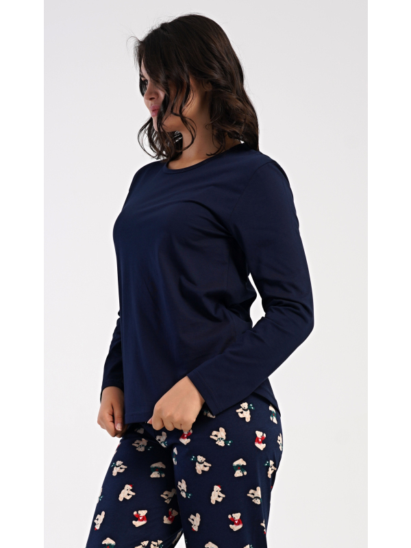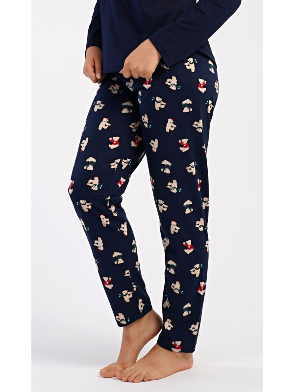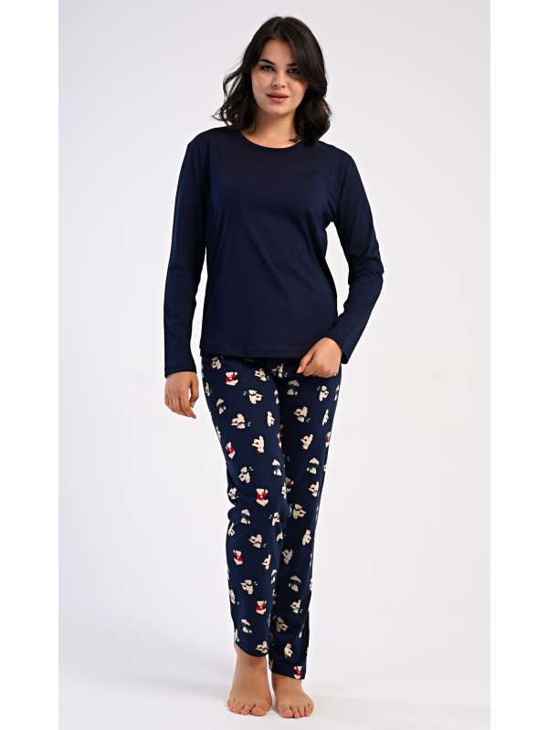Dámské bavlněné pyžamo s dlouhým rukávem Sabrina. Dámské bavlněné dlouhé pyžamo Sabrina. Dámské pyžamo se skládá z trika s dlouhým rukávem a dlouhých kalhot. Triko je jednobarevné, bez potisku, má kulatý výstřih. Kalhoty s potiskem medvídků mají v pase gumu a šňůrku na stažení, nemají kapsy. Použitý bavlněný materiál je poddajný a příjemný na dotek. Pokyny pro údržbu: -100 % bavlna Míry naměřené na výrobku: