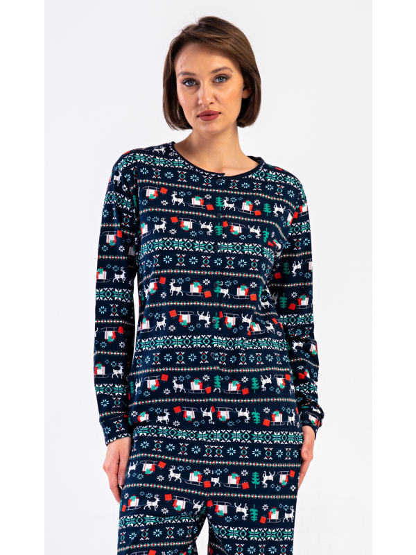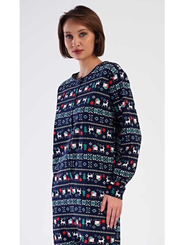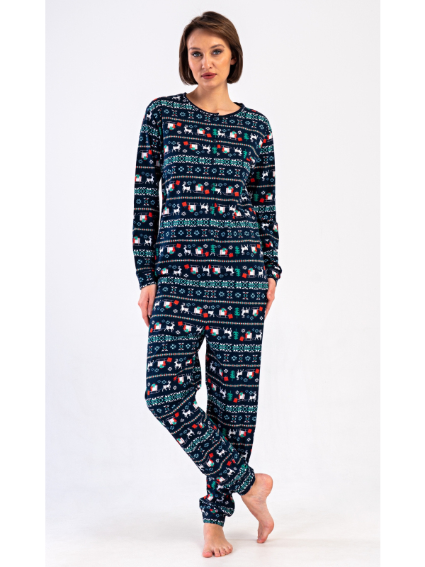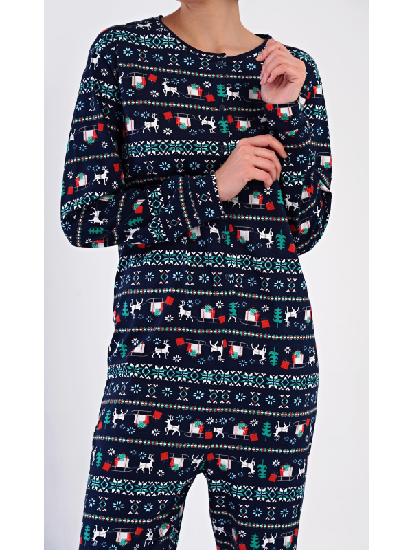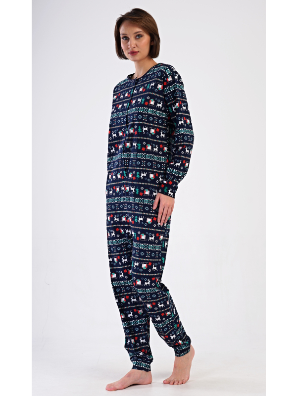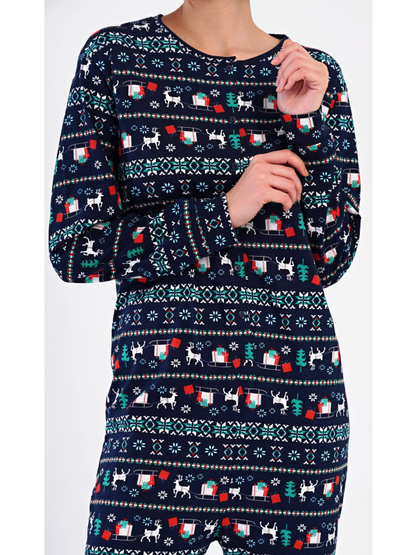 Dámský bavlněný overal Merry christmas. Overal je celopropínací, potištěný vánočními motivy. Dlouhé nohavice a rukávy jsou ukončeny lemy. Bavlněný materiál je poddajný a příjemný na dotek.