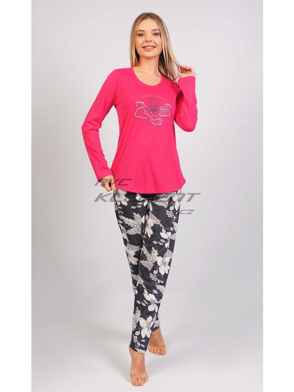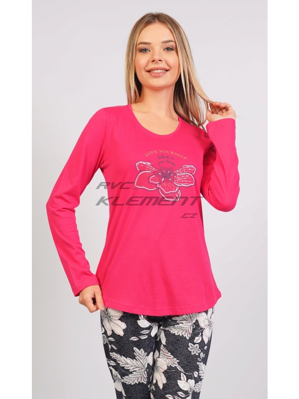 Dámské bavlněné pyžamo dlouhé Martina. Dámské pyžamo se skládá z trika s dlouhým rukávem a dlouhých kalhot. Na tričku je obrázek květu a nápis ’Love Yourself - Believe on your dreams’. Květinový motiv se opakuje i na dlouhých kalhotách, které mají v pase gumu a šňůrku na stažení, nemají kapsy. Použitý bavlněný materiál je poddajný a příjemný na dotek.