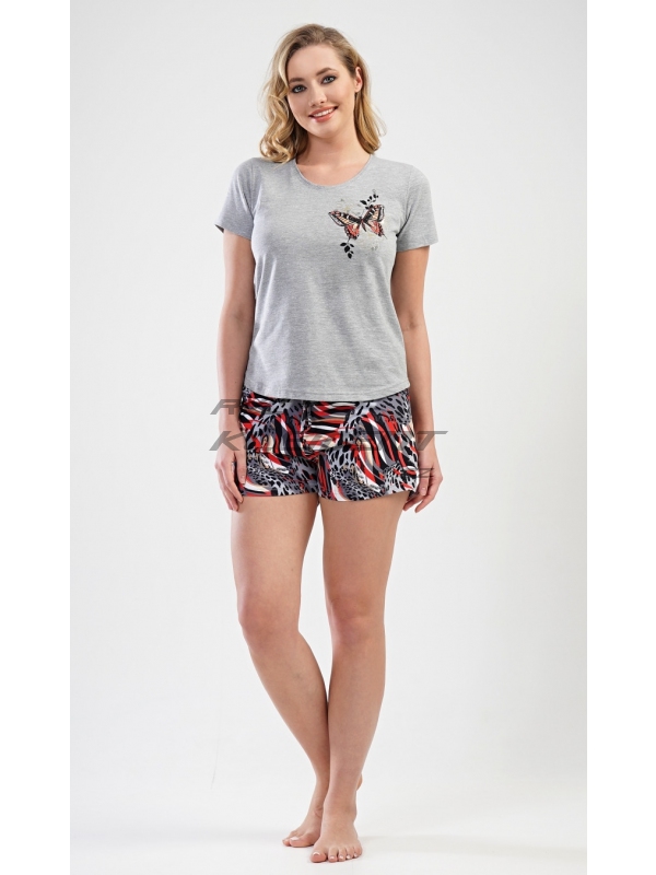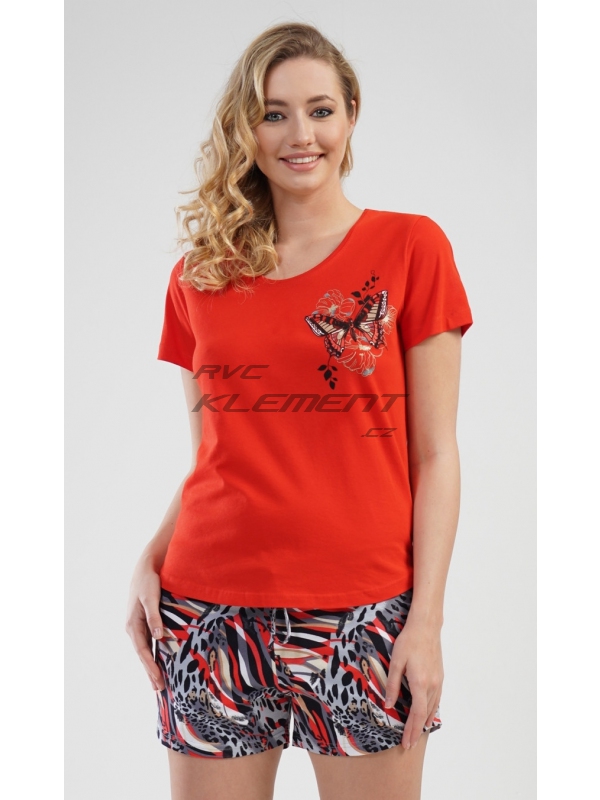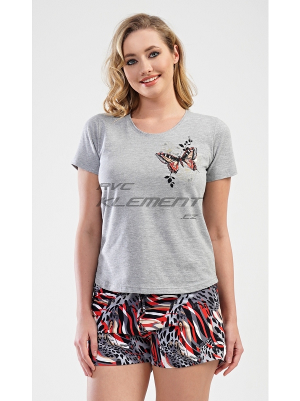 Dámské pyžamo šortky Motýli. Dámské pyžamo šortky Motýli. Dámské pyžamo se skládá z trička s krátkým rukávem a krátkých šortkových kalhot. Na tričku s kulatým výstřihem je obrázek barevného motýla, tričko pak doplňují šortky s abstraktními vzory. Použitý materiál je příjemný a poddajný na dotek. Materiál u šortek má obsah bavlny 100%. Červené triko má 100% bavlny a světle šedé 70%. Pokyny pro údržbu: - 100% bavlna triko červené), 70%bavlna, 30% polyester (triko šedé) Míry naměřené na výrobku: