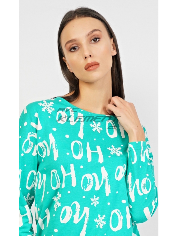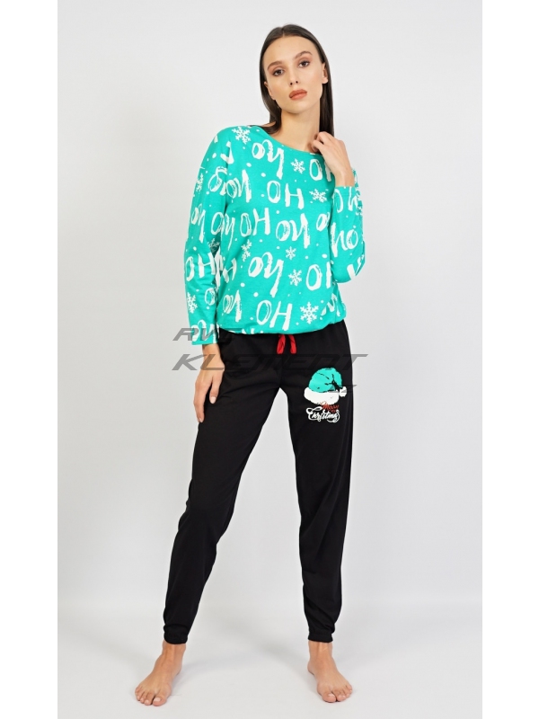 Dámské bavlněné pyžamo dlouhé Santa. Dámské bavlněné pyžamo dlouhé Santa. Dámské pyžamo se skládá z trika s dlouhým rukávem a dlouhých kalhot. Triko je potištěné nápisy ’HO ho’ a vločkami, spodní lem je zakončen gumou. Černé kalhoty mají potisk čepice Santy a nápis ’Merry Christmas’. Kalhoty jsou v pase do gumy a nemají kapsy, nohavice jsou dole zakončeny lemem s gumou. Použitý bavlněný materiál je poddajný a příjemný na dotek. Pokyny pro údržbu: - 100% bavlna