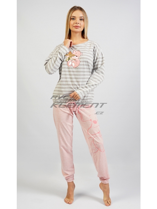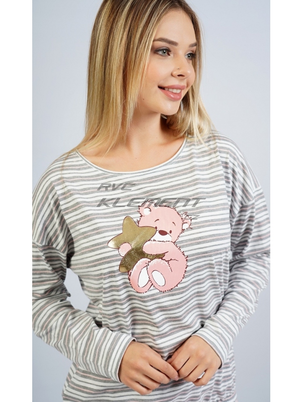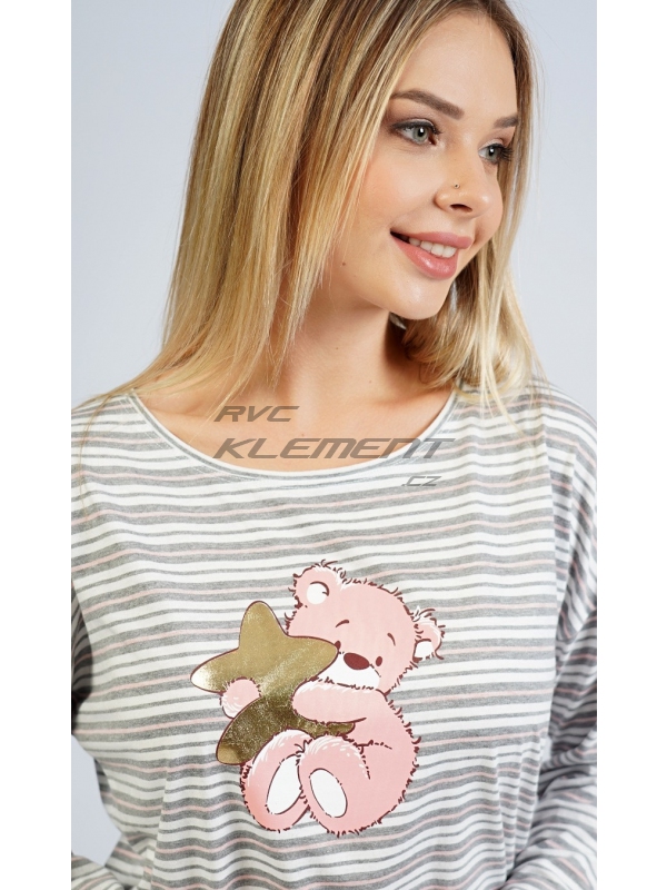 Dámské pyžamo dlouhé Méďa s hvězdou. Dámské pyžamo dlouhé Méďa s hvězdou. Dámské pyžamo dlouhé se skládá z trika s dlouhým rukávem a dlouhých kalhot. Na pruhovaném triku je medvídek s pozlacenou hvězdou.Triko má šňůrku na stažení. Motiv medvídka se opakuje i na kalhotách. Kalhoty mají v pase gumu a šňůrku na stažení, jsou bez kapes. Použitý materiál s obsahem bavlny 70% je příjemný a poddajný na dotek. Pokyny pro údržbu: -70% bavlna, 30% polyester Míry naměřené na výrobku: