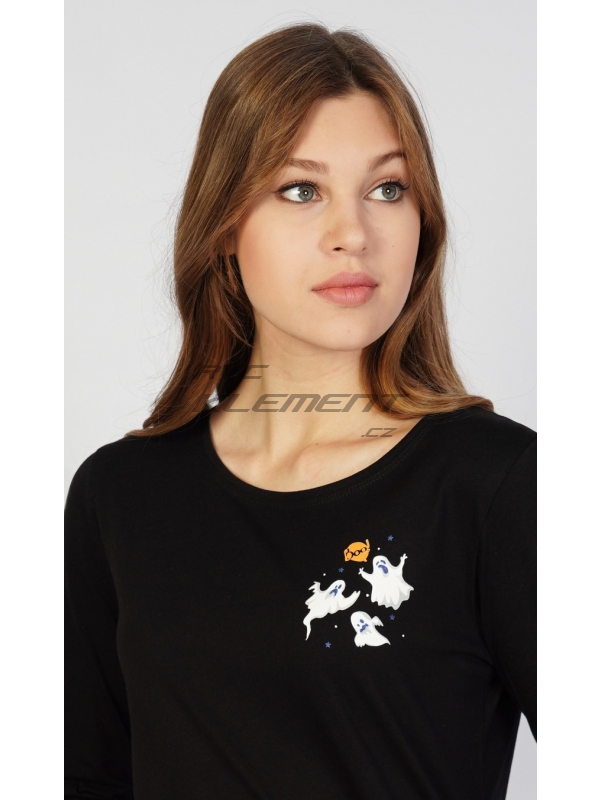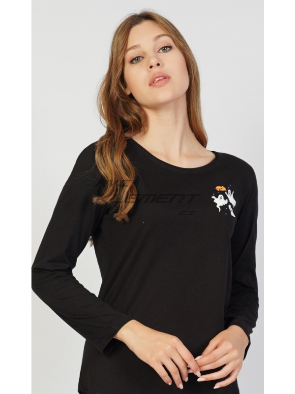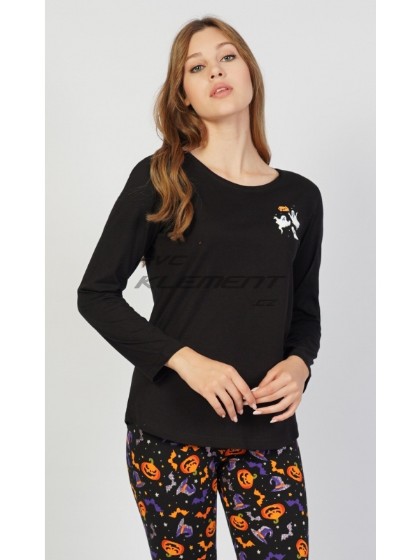 Dámské pyžamo dlouhé Halloween. Dámské pyžamo se skládá z trika s dlouhým rukávem a dlouhých kalhot. Na triku je malý obázek s halloweenskými motivy, které se opakují i na dlouhých kalhotách. Kalhoty mají gumu a šňůrku na stáhnutí, nemají kapsy. Použitý bavlněný materiál je poddajný a příjemný na dotek.