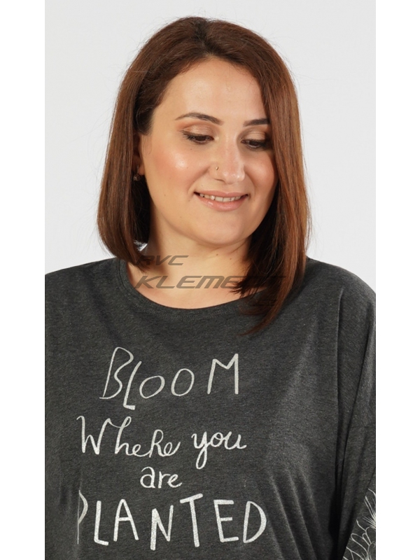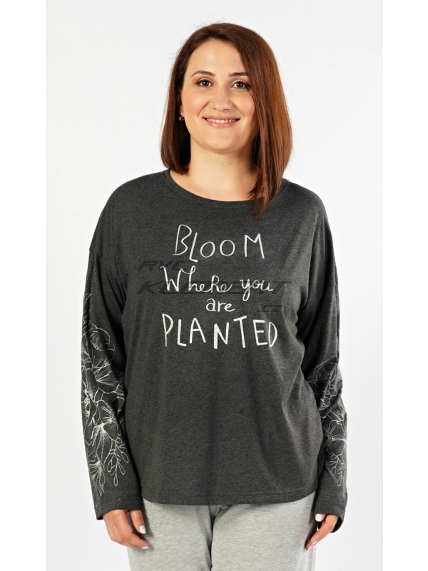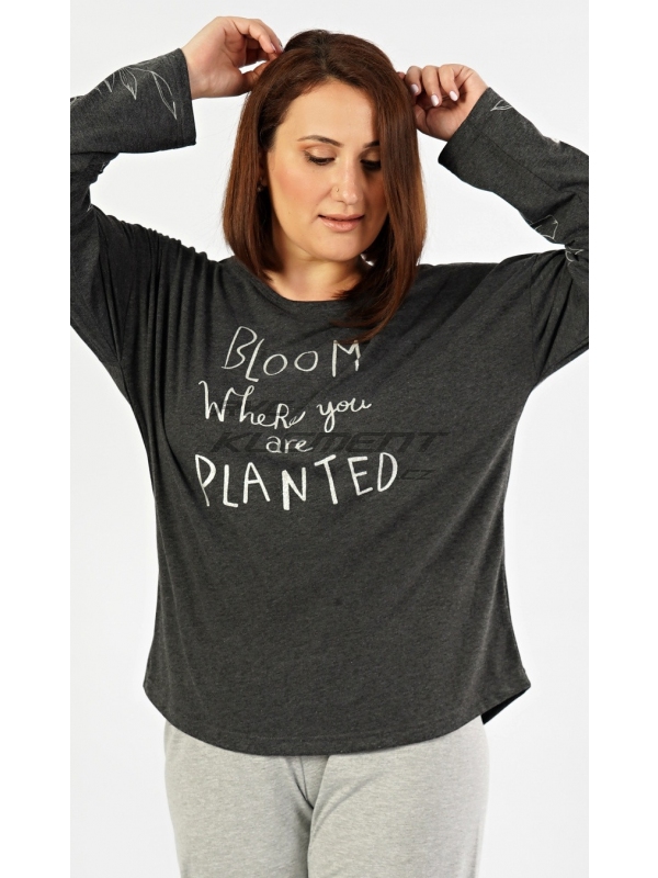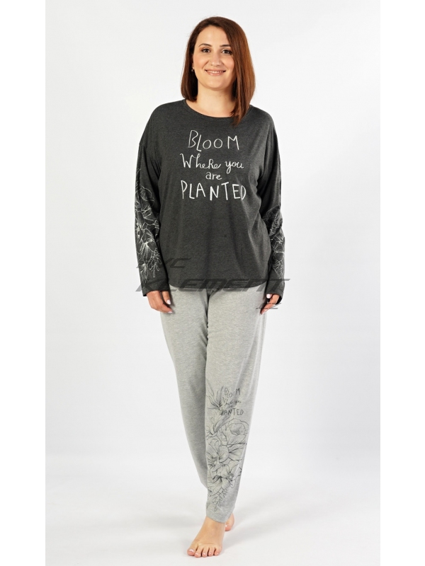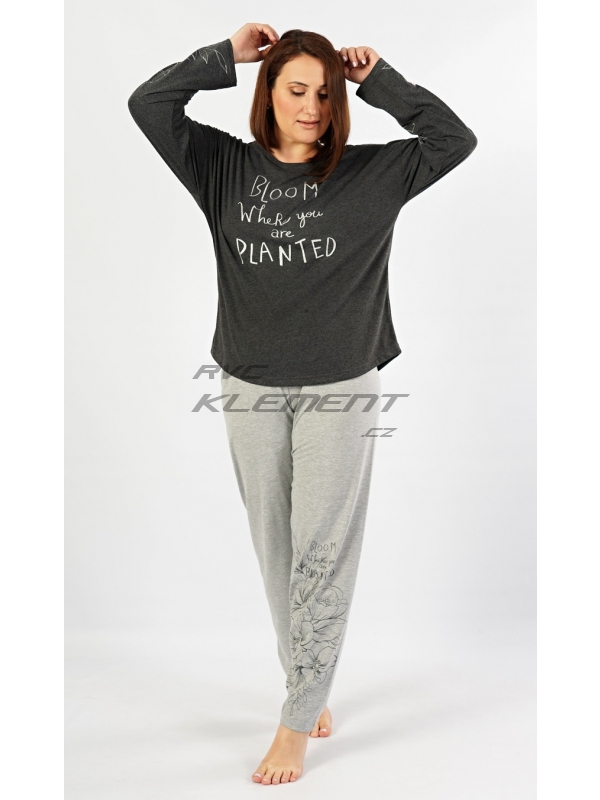 Dámské pyžamo dlouhé Berenika. Dámské pyžamo se skládá z trička s dlouhým rukávem a dlouhých kalhot. Triko je v tmavě šedé barvě se stříbrným nápisem a květinami na rukávu. Kalhoty jsou světle šedé s opakujícím se motivem jako na triku, jsou do gumy a na stažení šňůrkou. Použitý materiál s obsahem bavlny 70% je poddajný a příjemný na dotek.