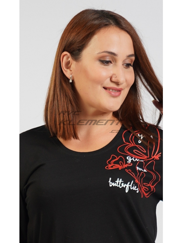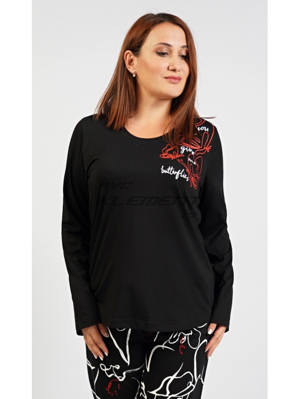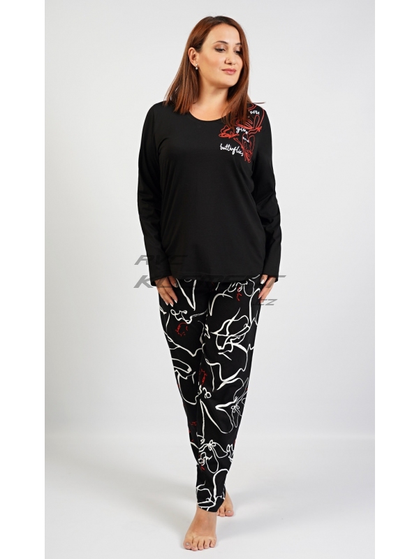 Dámské bavlněné pyžamo dlouhé Butterfly. Dámské bavlněné pyžamo dlouhé Butterfly. Dámské pyžamo dlouhé se skládá z trika s dlouhým rukávem a dlouhých kalhot. Na jednobarevném černém triku je potisk červených motýlů a bílý nápis. Kalhoty mají v pase gumu a šňůrku na stažení, jsou bez kapes. Použitý bavlněný materiál je příjemný a poddajný na dotek. Pokyny pro údržbu: - 100% bavlna Míry naměřené na výrobku:
